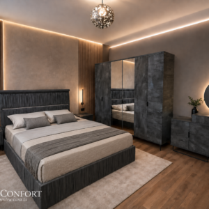Dormitor Sultan – Set dormitor modern cu pat matrimonial, dulap cu oglindă și comodă cu oglindă