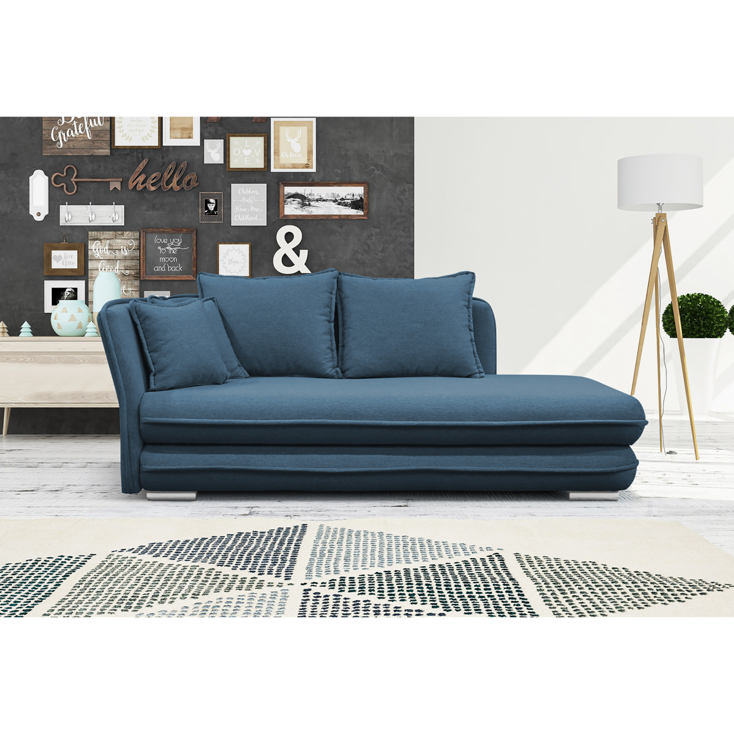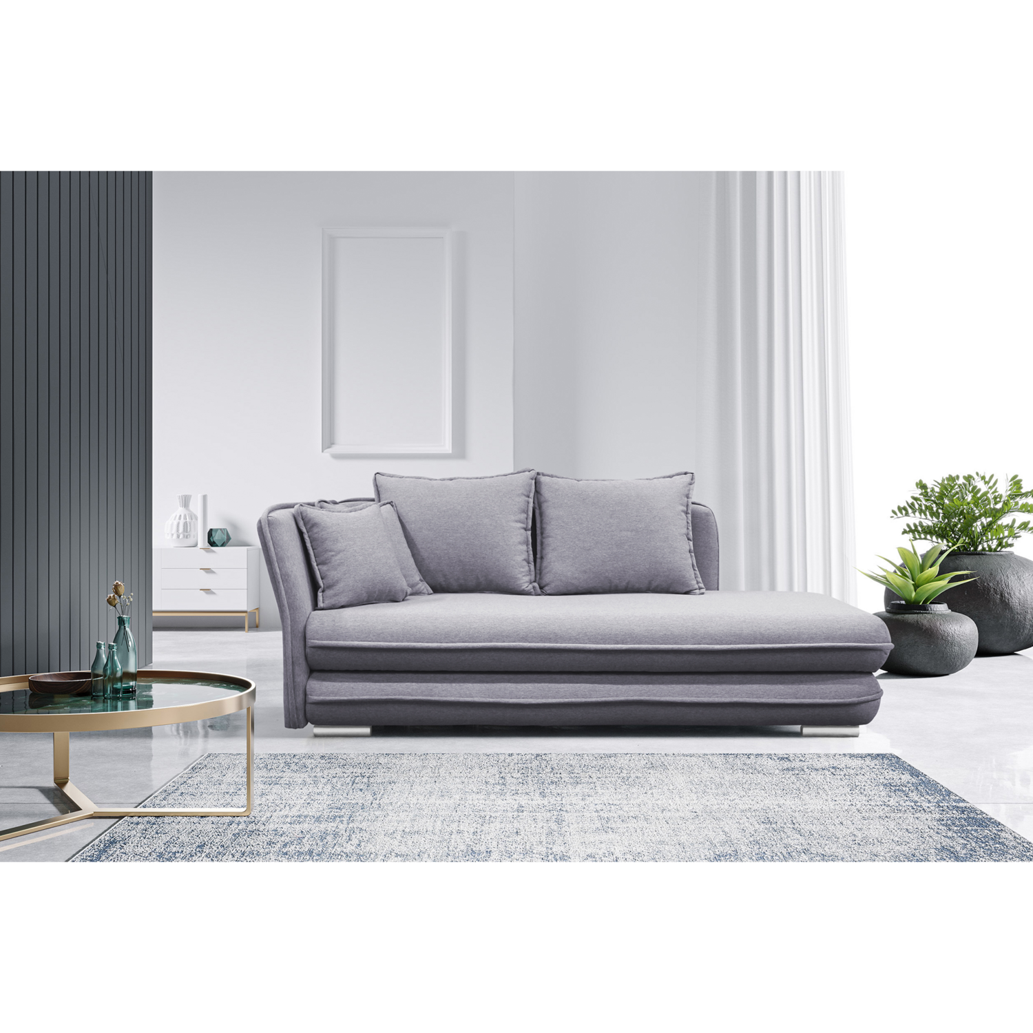 Foarte practic şi cu un aspect luxos. Astfel arată, la prima vedere, şezlongul LAMBA. Tapiţat cu material Whisper, care este foarte plăcut la atingere şi evidenţiază designul elegant al şezlongului şi liniile sale curate. Îmbrăcat în culoarea albastră/ gri. Va ieşi în evidenţă atât în interioarele moderne, cât şi în cele tradiţionale. Susţinut de picioare de plastic de culoare argintie LAMBA are un spaţiu de depozitare şi o suprafaţă de dormit de 95×203 cm. În set sunt incluse patru perne. Bucuraţi-vă de odihnă netulburată şi de confort maxim cu şezlongul LAMBA. Variantă pentru partea dreaptă/ stanga