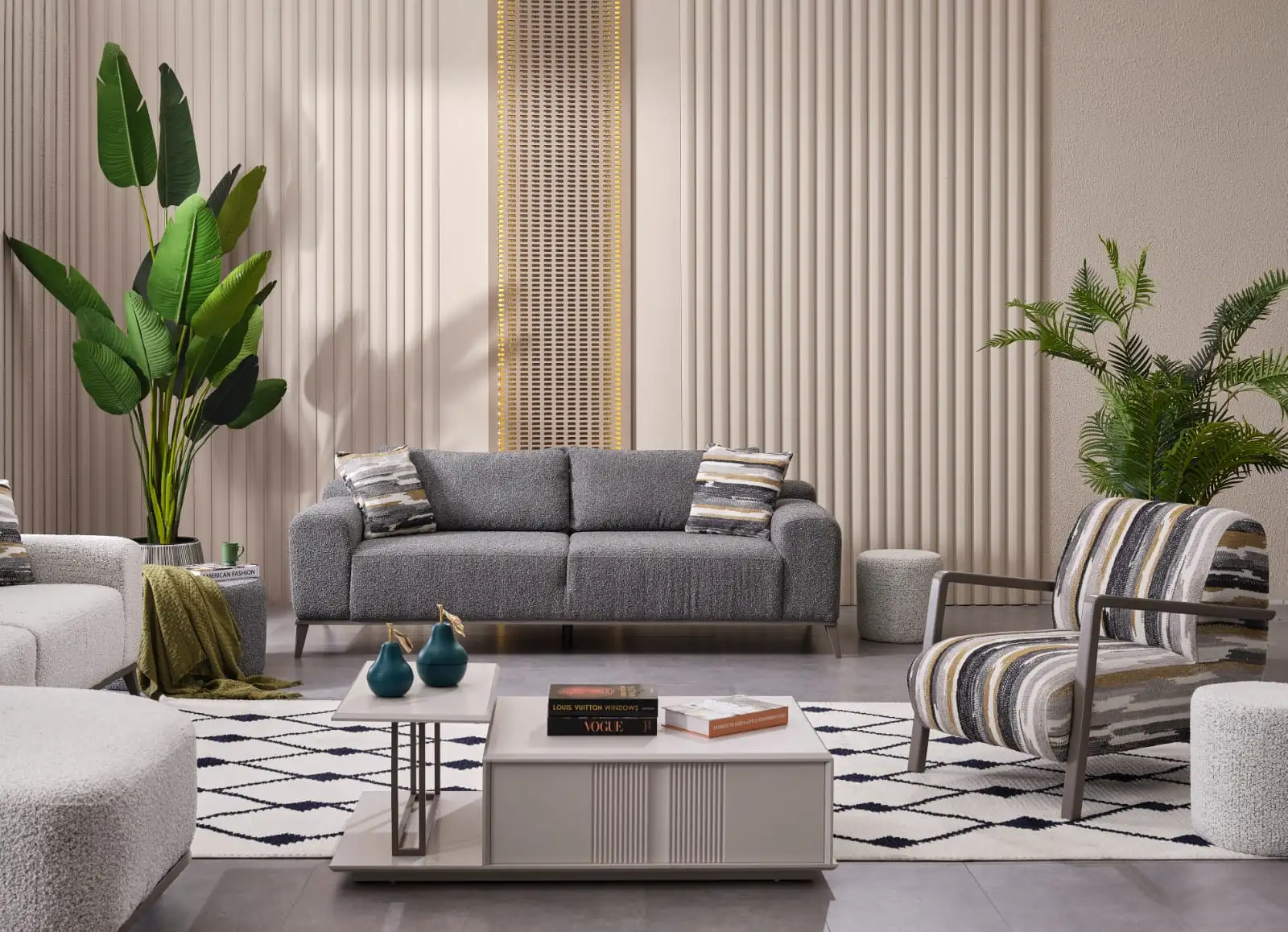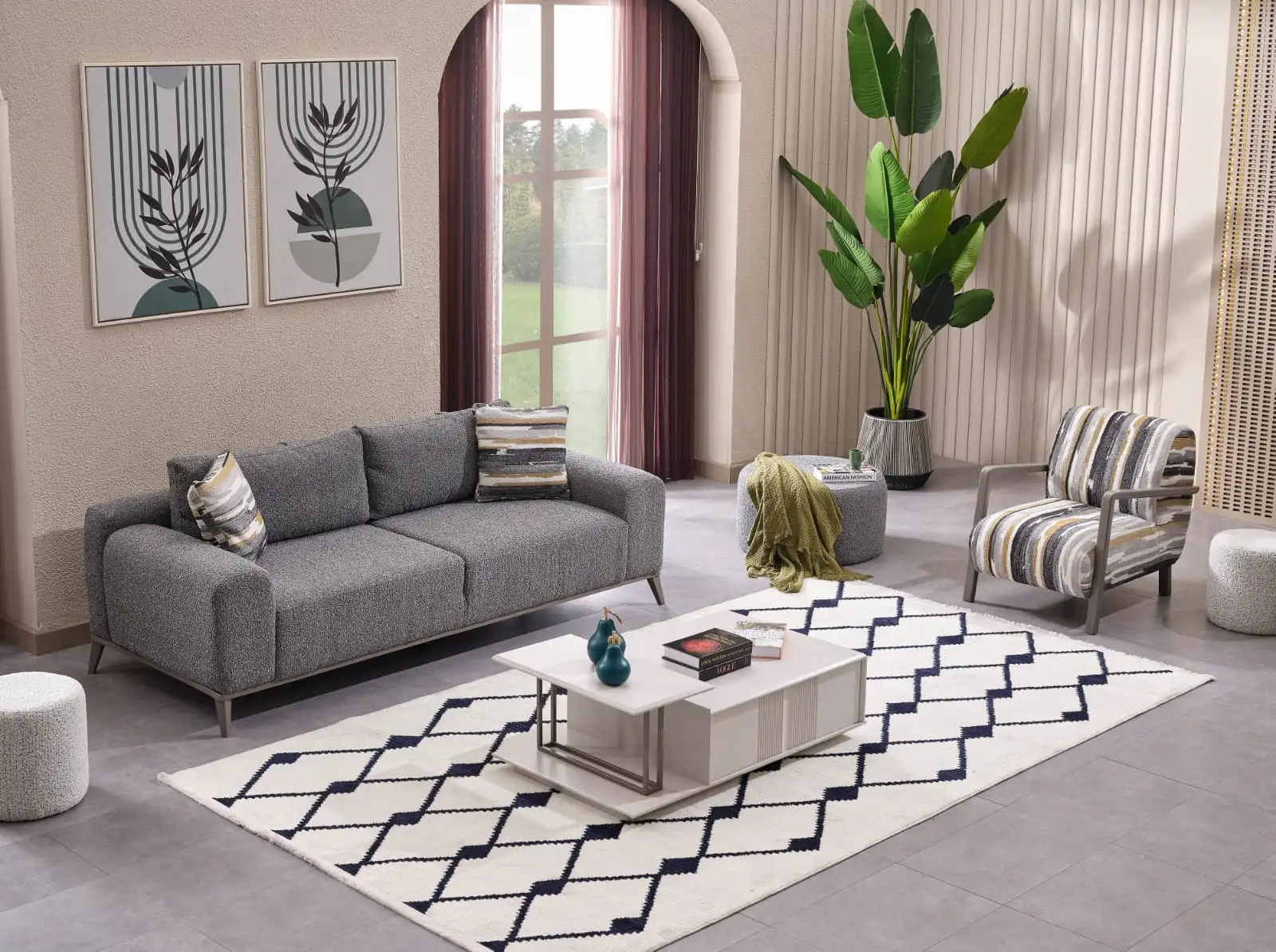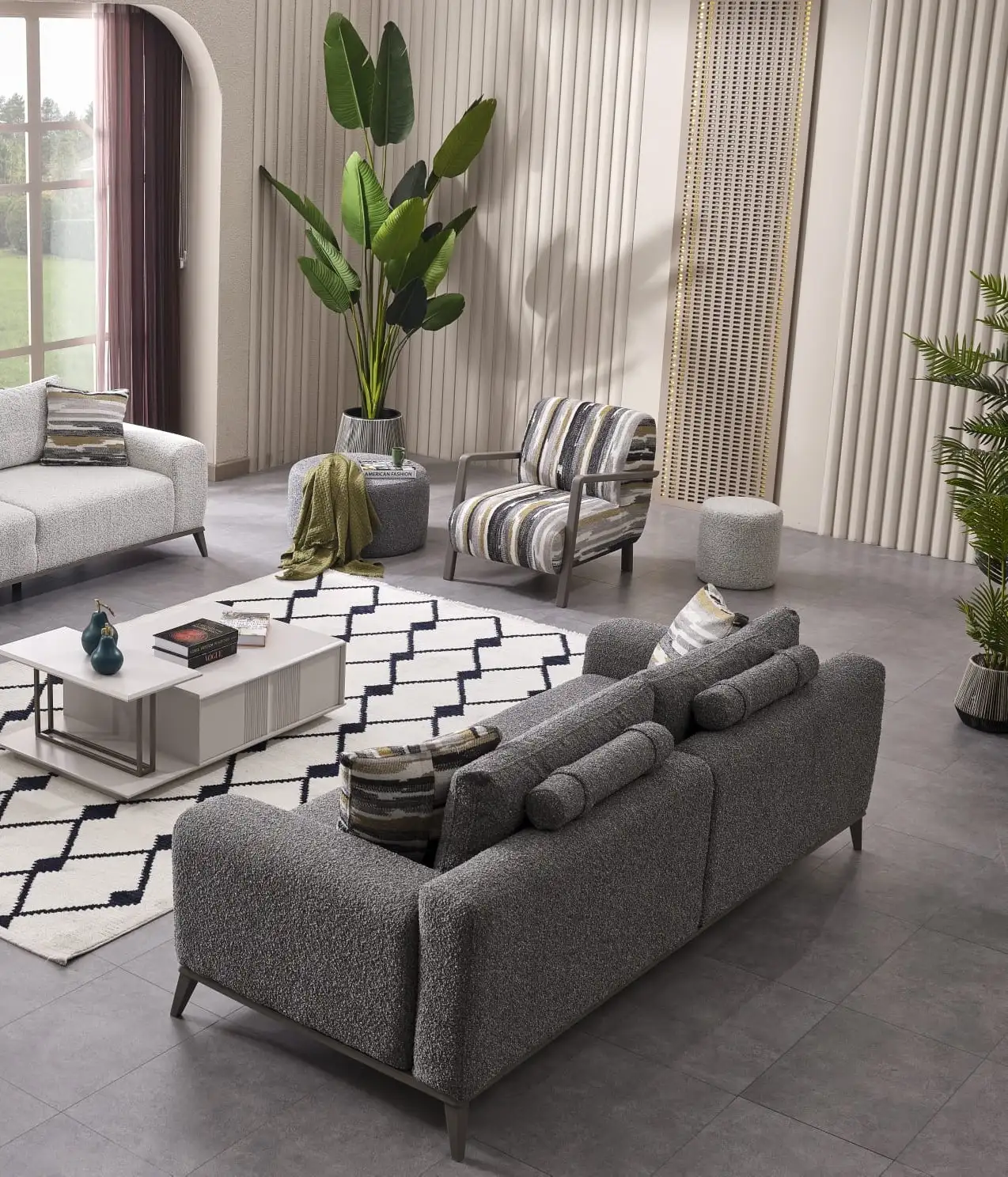 Confortul este accentuat de matlasarea geometrică,sezuturi din poliuretan indeformabil cu densitate 25-30 Kg/mc, acoperite cu Tecnoform, sustinute de centuri elastice din propilena si latex. Cadrul canapelei este unul rezistent, cu picioare fabricate din lemn masiv. Cu calitatea sa excepțională este piesa centrală care va transforma orice încăpere într-un sanctuar al designului și confortului.