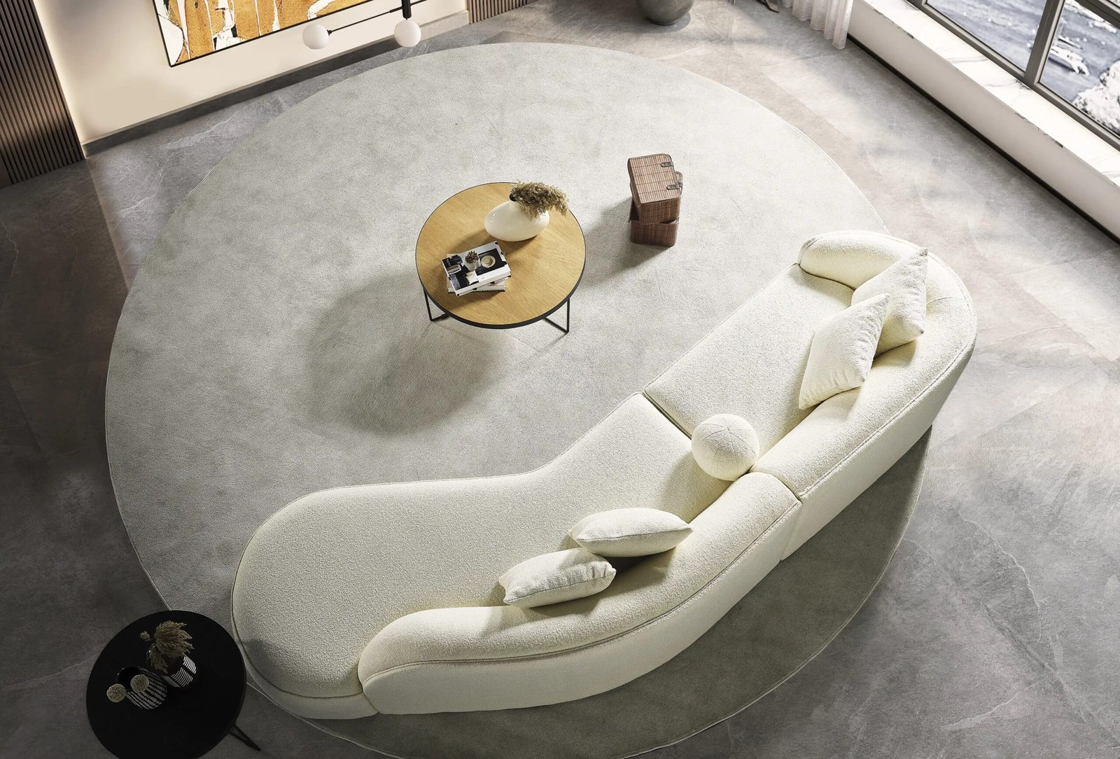 Picioarele joase, abia vizibile, completează estetica modernă a designului, conferind un aspect rafinat și aerisit.