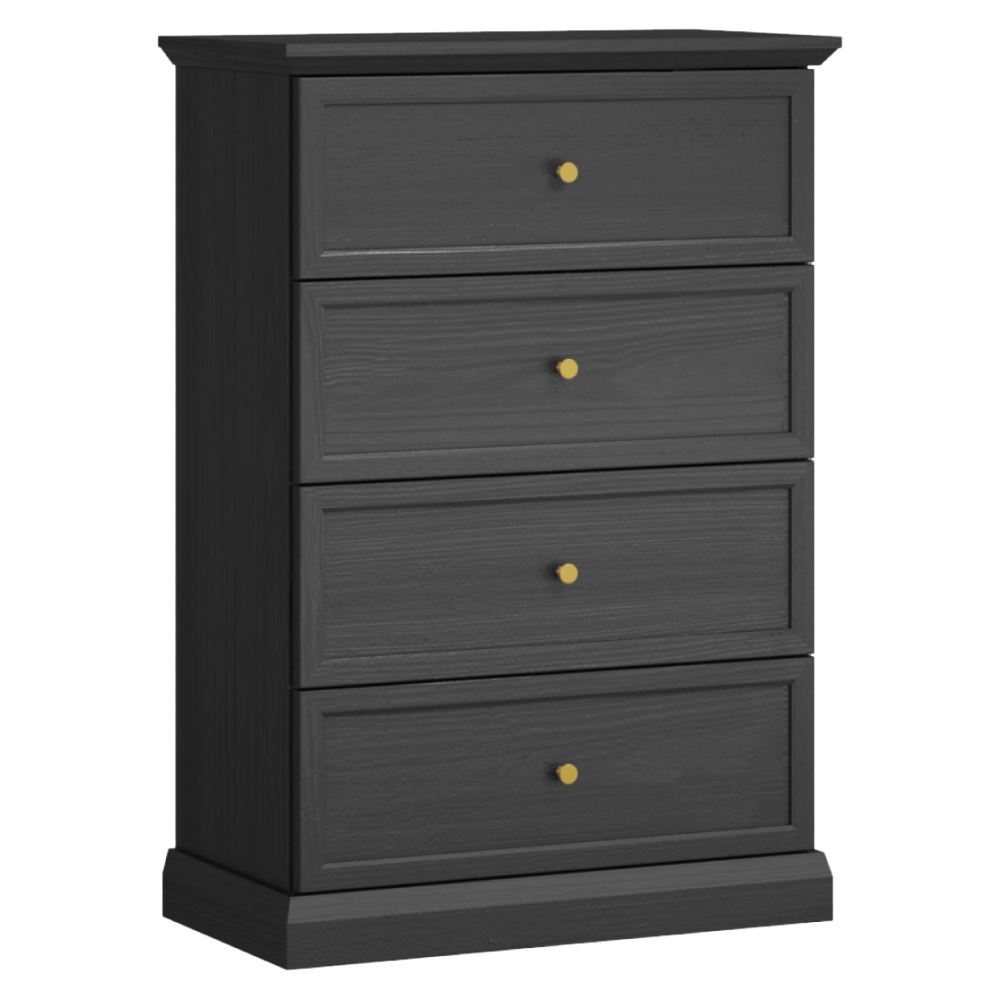 Comoda LOCCA oferă îndeajuns spaţiu de depozitare sub forma a patru sertare echipate cu mânere aurii. Partea de sus a comodei va servi drept suprafaţă pentru decoraţiuni care pot înviora interiorul.