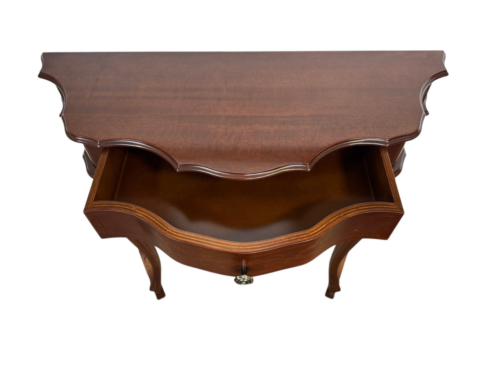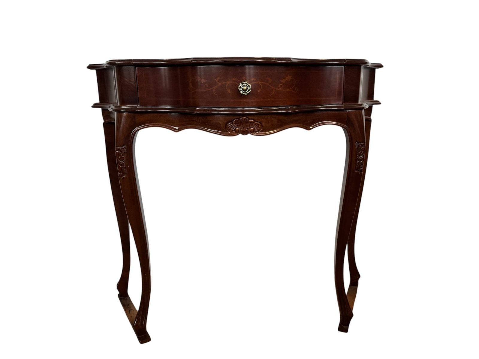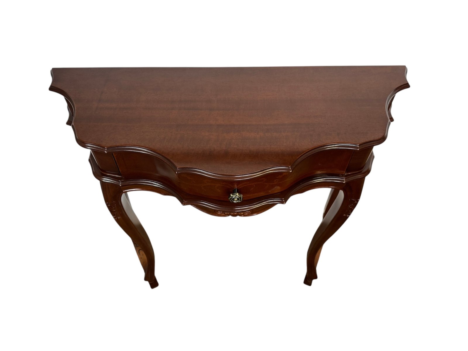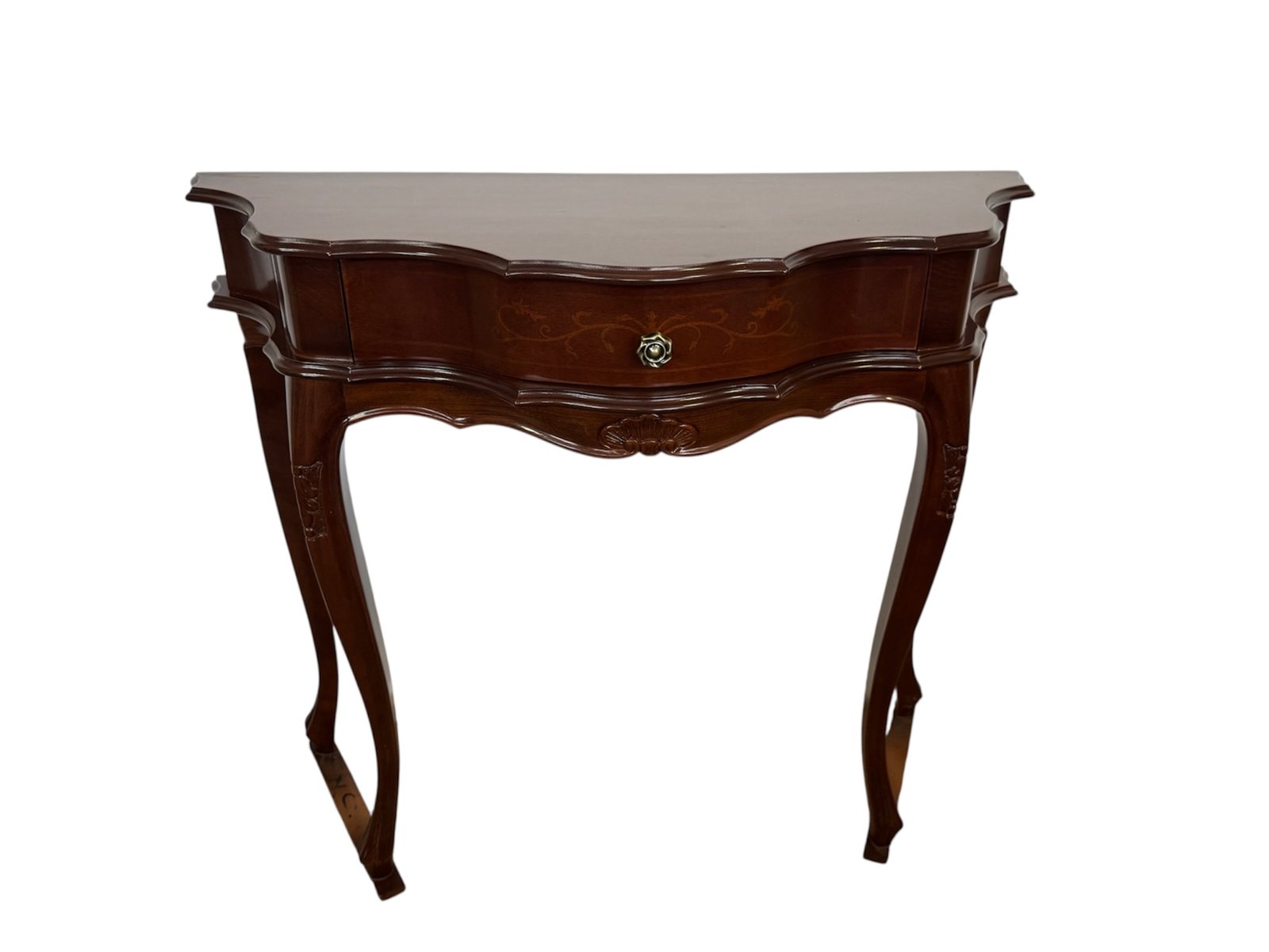 Designul se remarcă prin liniile curbe ale blatului, picioarele elegant arcuite și decorațiunile fine sculptate, care adaugă un aer sofisticat. Consola este prevăzută cu un sertar discret, ideal pentru depozitarea obiectelor mici, păstrând în același timp un aspect curat și aerisit.