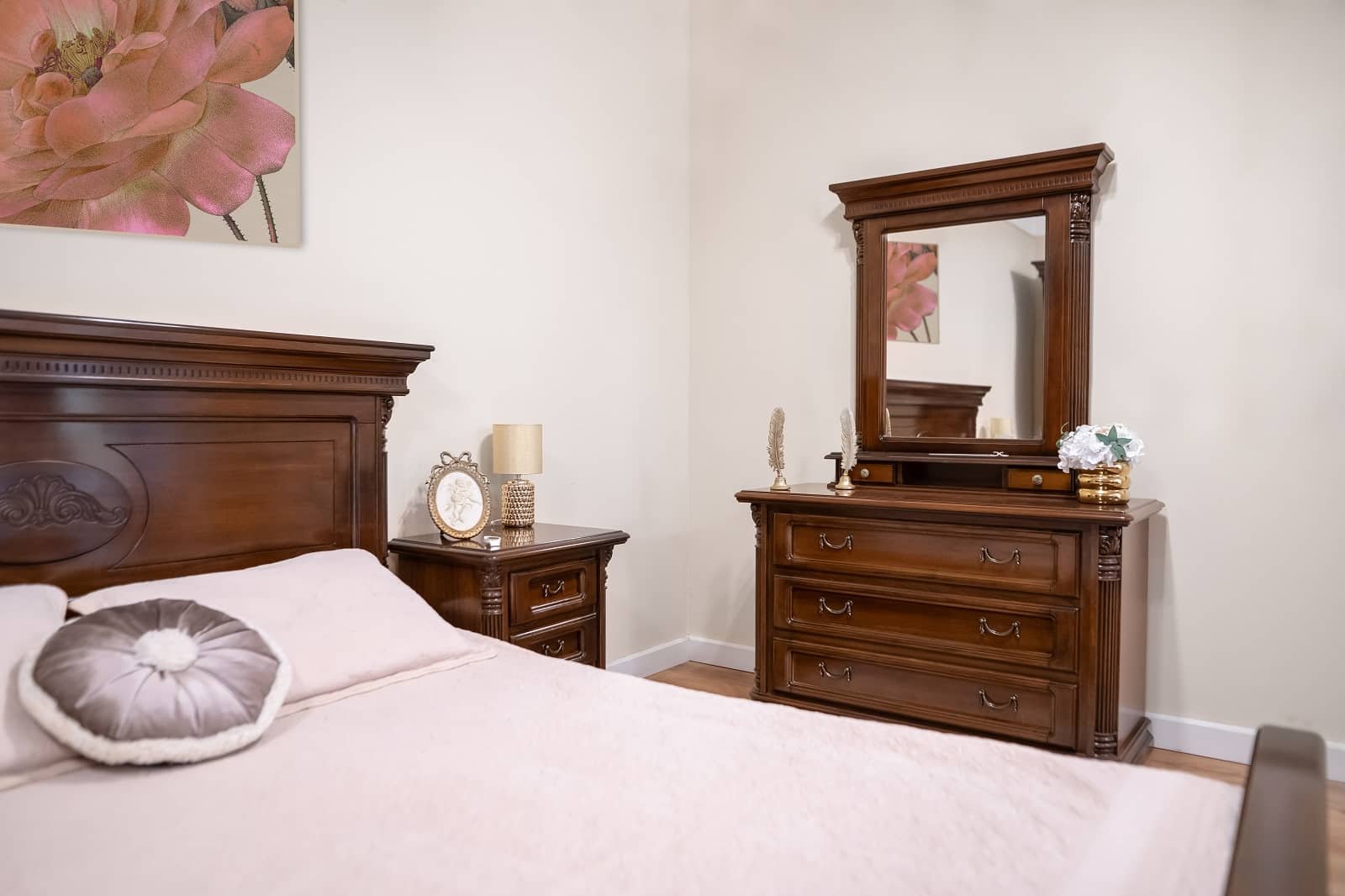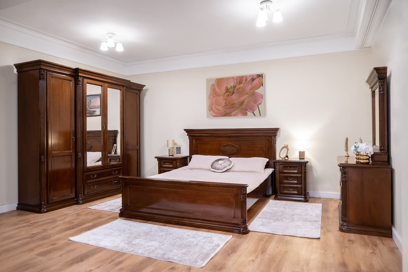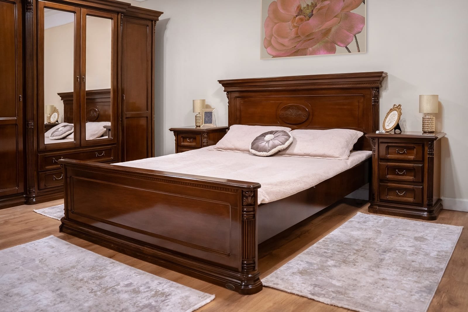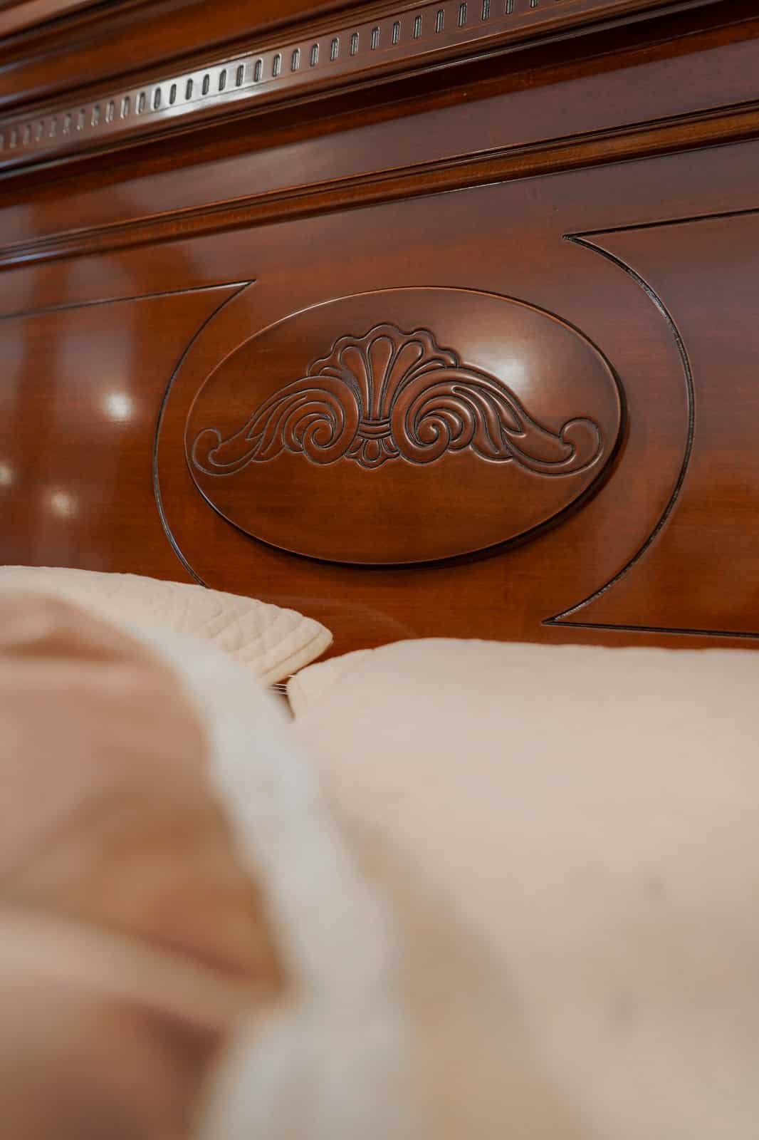 Inspirat de echilibrul dintre tradiție și inovație, dormitorul „Cristina II” este definit prin liniile sale curate și armonia estetică a designului său. Acest set este creat din lemn masiv de fag și tei, materiale recunoscute pentru robustețea și longevitatea lor, care promit să traverseze generații. Mestesugul manual este evidențiat în elementele ornamentale elaborate, fiecare cu particularitățile sale unice, ce adaugă o dimensiune sculpturală ansamblului. Îmbinând panourile de PAL și MDF, finisate cu o atenție meticuloasă folosind furnire naturale de nuc, „Cristina II” reflectă un angajament pentru finisaje de înaltă calitate și o atenție deosebită pentru detalii. Designul sofisticat, împreună cu tonurile calde ale lemnului, conferă un sentiment de căldură și confort, invocând o atmosferă de liniște și relaxare.