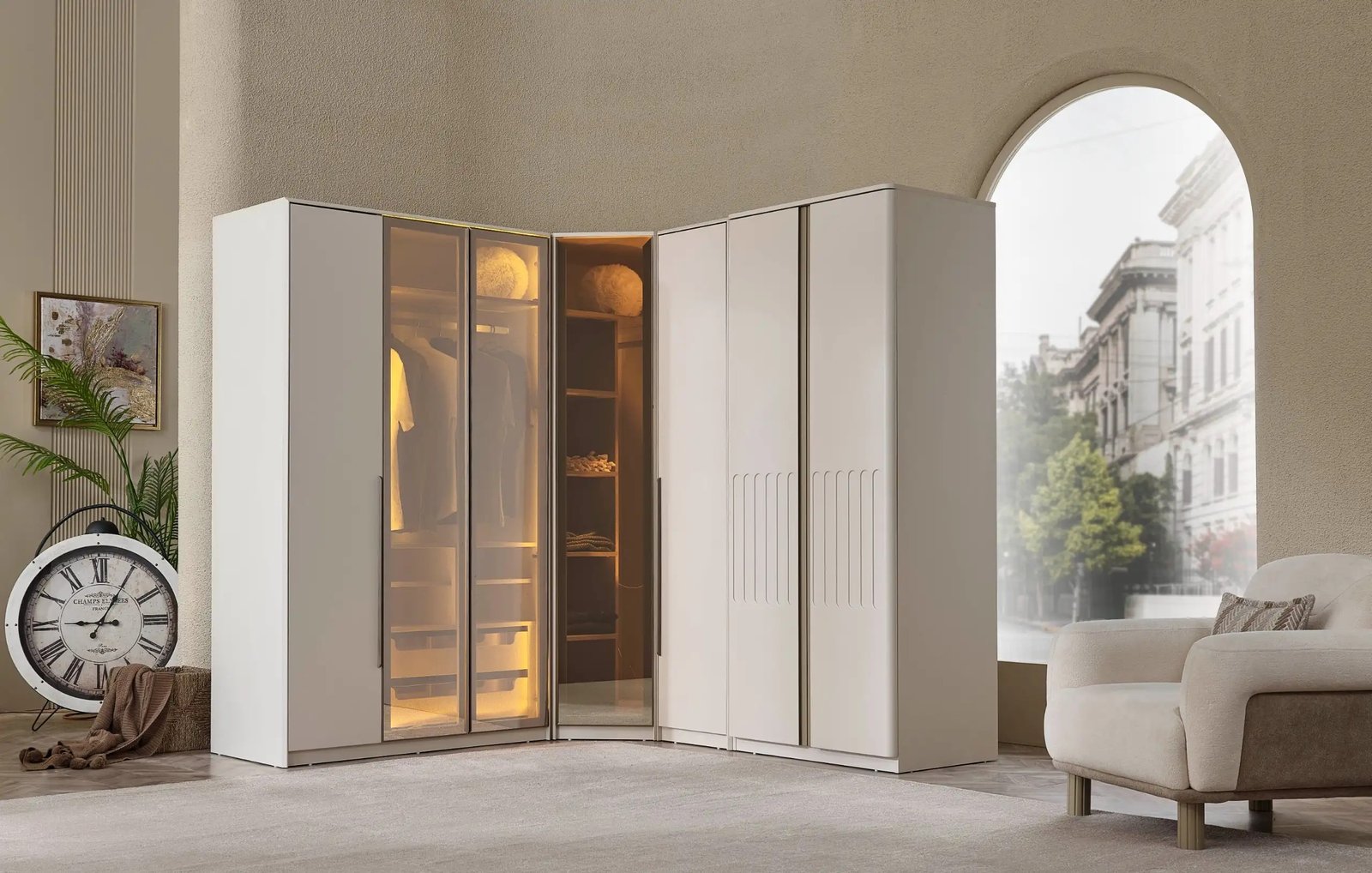 Dulapul modular cu 7 usi Verona vă oferă un spațiu de depozitare ordonat cu volumul său interior mare.In cele 7 compartimente, îți poți depozita hainele, accesoriile și alte bunuri într-o manieră ordonată. În acest fel, camera ta arată mai îngrijită și ordonată.Dulapul Verona confectionat din PAL+MDF este impecabil executat iar interiorul este prevăzut cu numeroase polițe ,bari si sertare unde vă puteți depozita îmbrăcămintea, dulapul este piesa de mobilier care imbina eleganta cu functionalitatea.Dulap cu uși din sticlă securizată,siguranță și estetică, cu sticlă reflectorizantă temperată si sistem LED în dulap cu senzor,iluminare inteligentă care se activează automat la deschiderea ușilor.