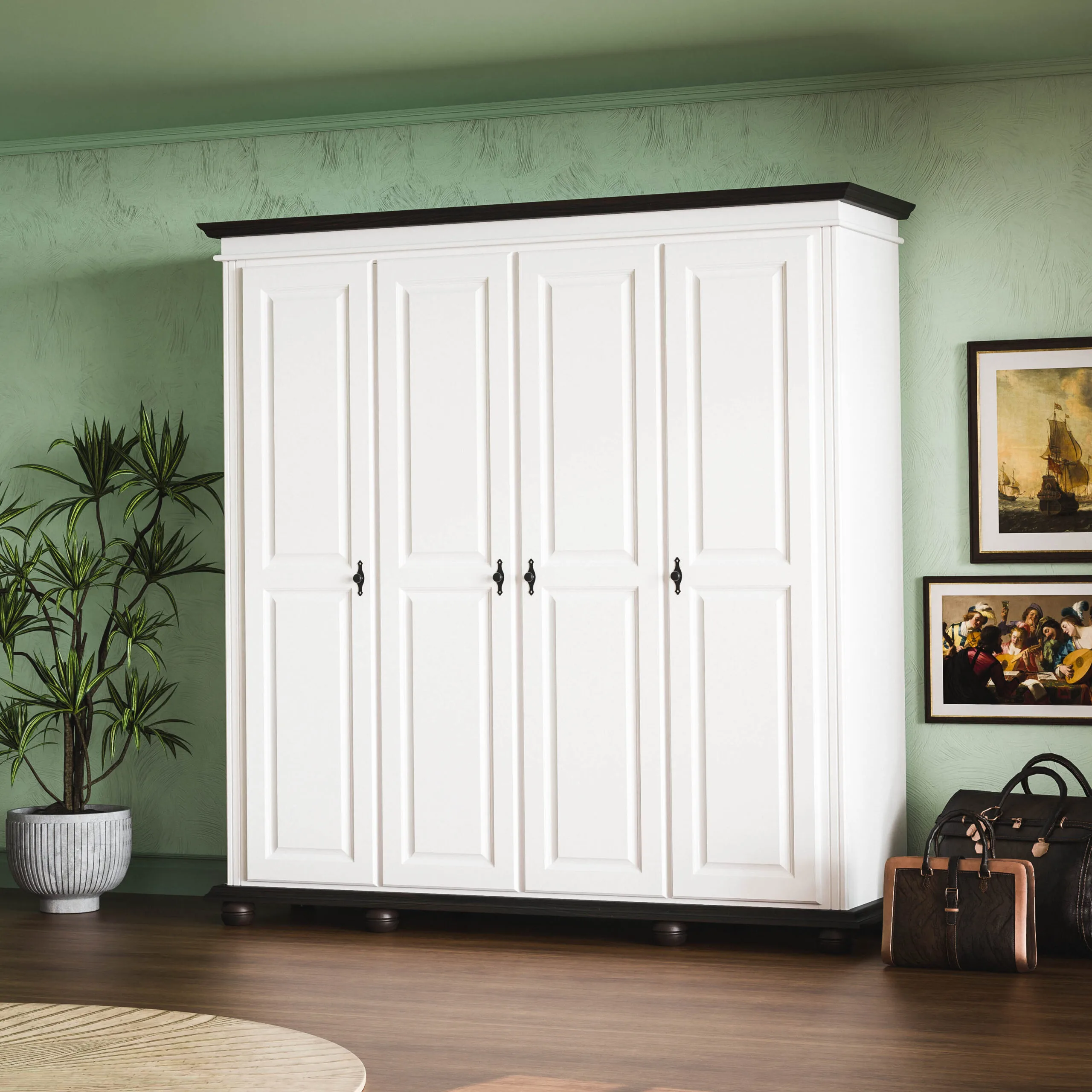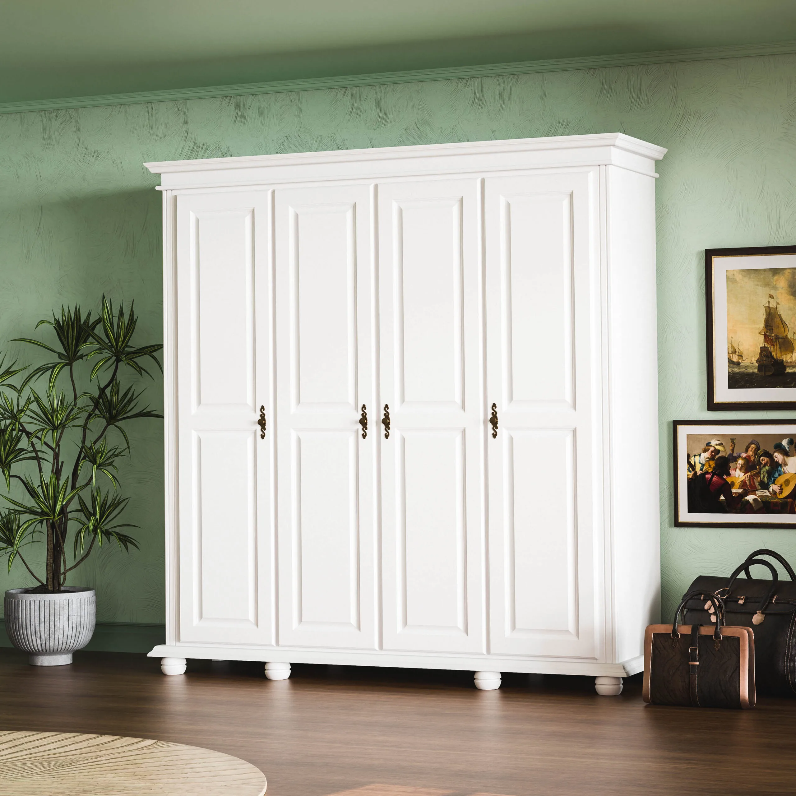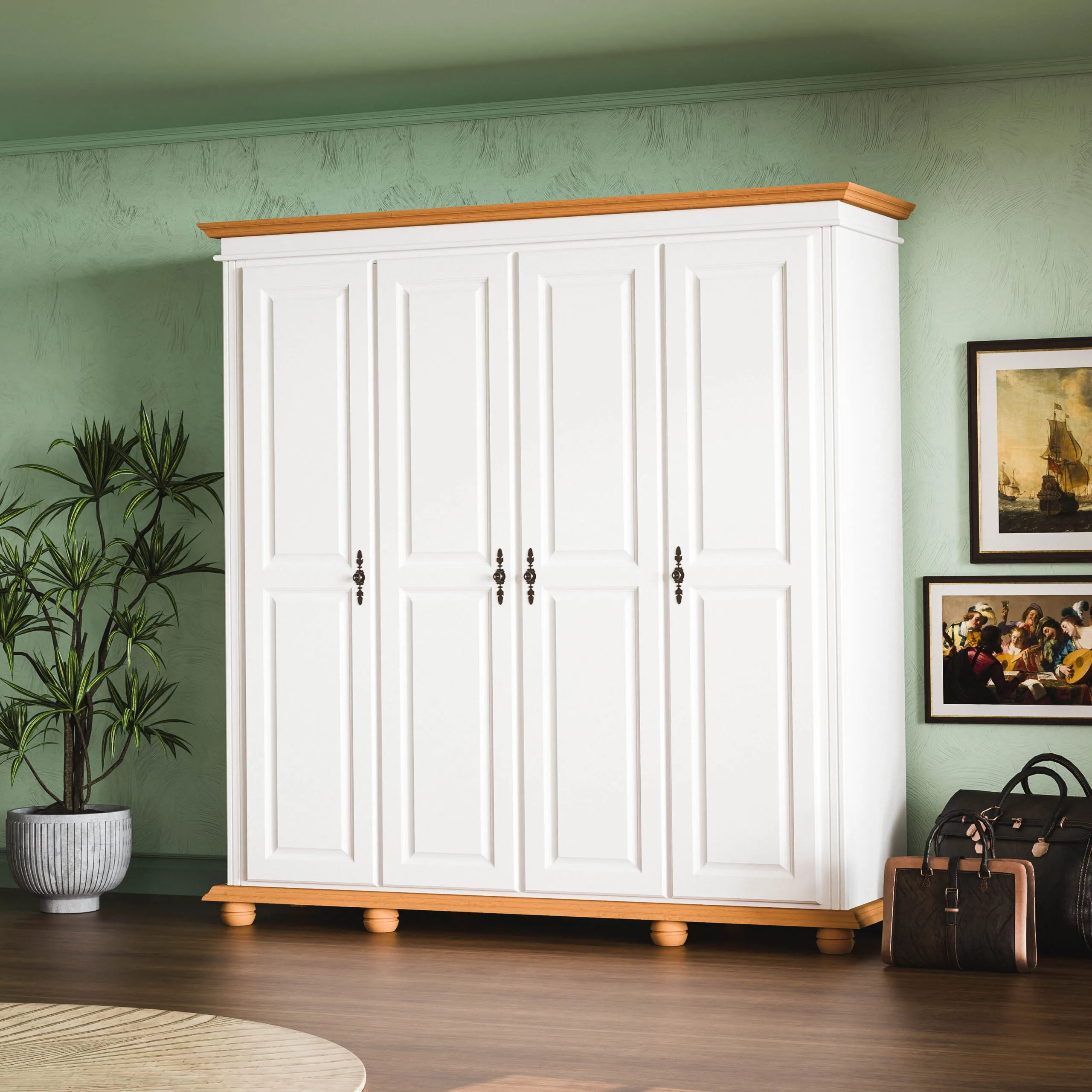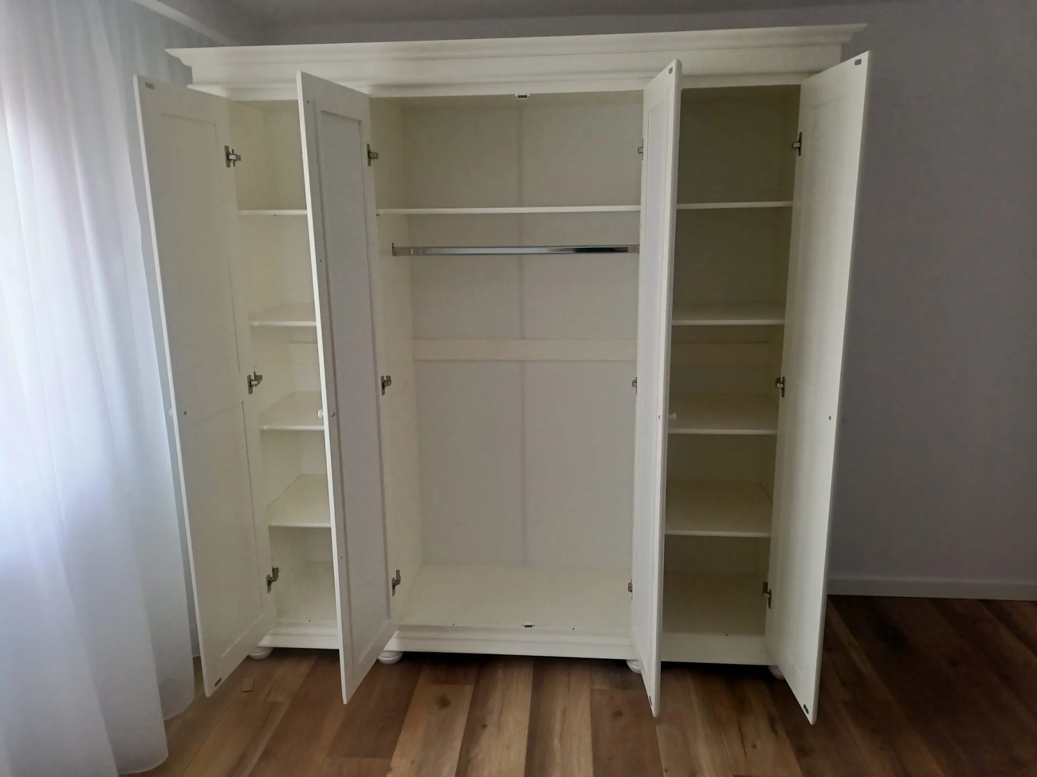 Dulap Emilian cu 4 uși din lemn masiv fără oglinzi este o piesă de mobiler ce se potrivește atât în amenajarile clasice cât și în cele moderne. Fiind spatios și elegant se face util în orice locuință.