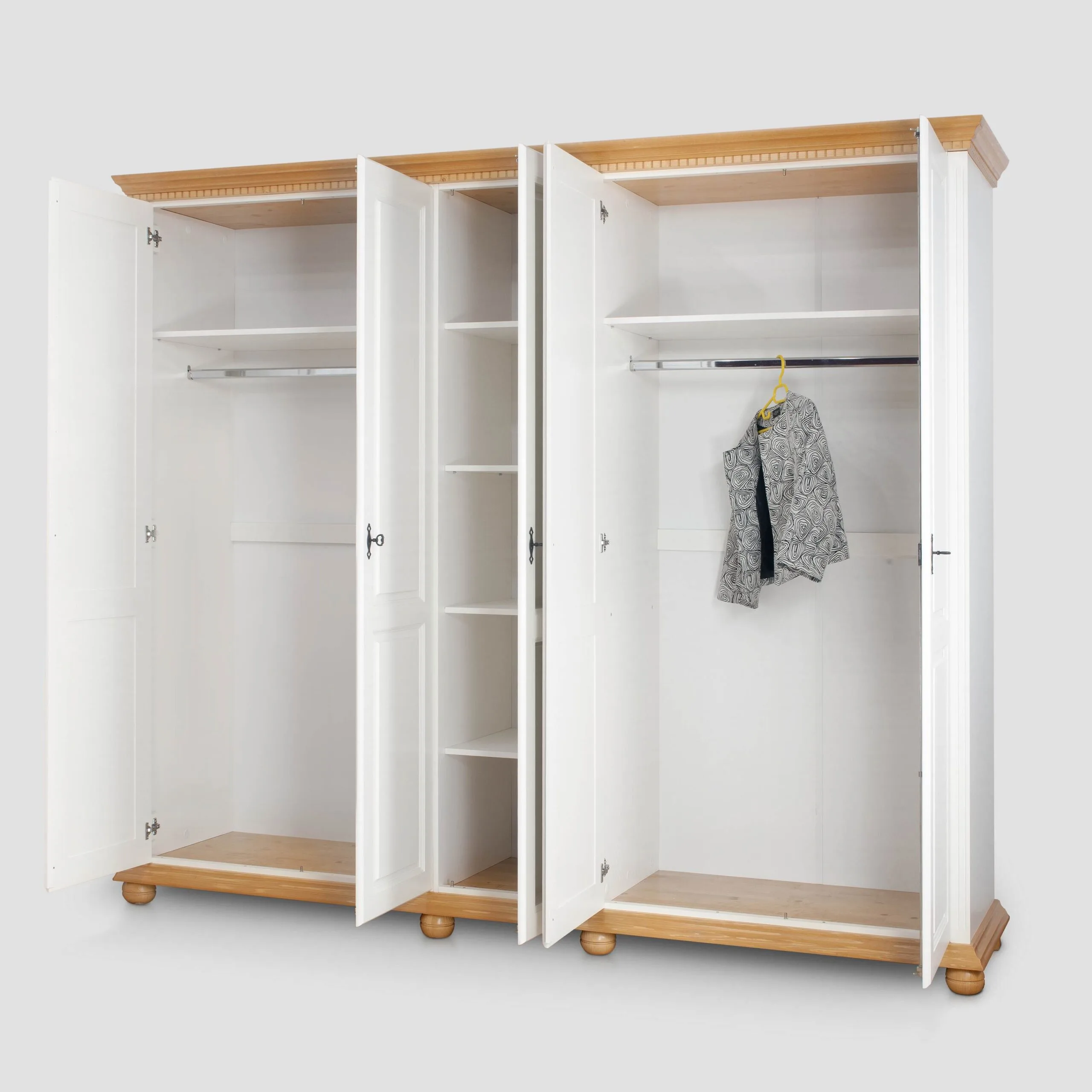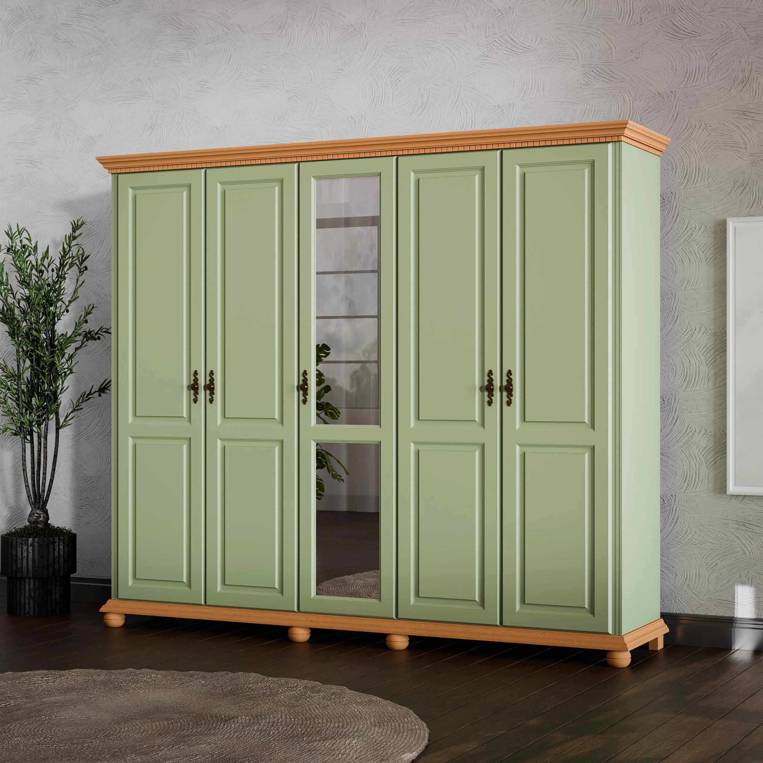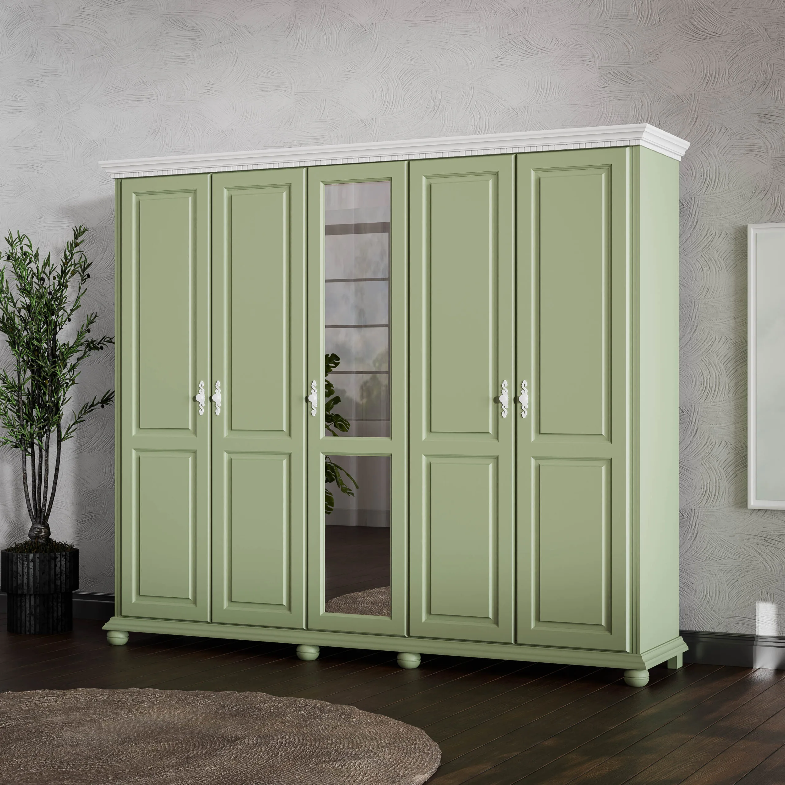 Dulapul cu 5 usi Bogdana Salvie face parte din categoria mobilierului maret, impunator. Desi necesita mai mult spatiu, avand lungimea de 2,60 m, ofera confort in aranjarea rochiilor lungi, paltoanelor,etc. Conceput a putea fi lacuit in alb, alb/miere, alb/ nuc se poate asorta usor in locuinta dumneavoastra.