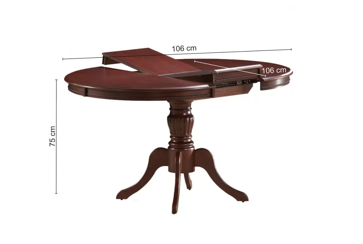 Masa Janine este alegerea ideală pentru cei care își doresc o piesă elegantă, dar și practică în același timp. Designul rotund oferă un ambient cald și prietenos în utilizarea zilnică, iar funcția de extensie transformă rapid masa într-un spațiu generos pentru momentele în care ai invitați. Finisajul nuc închis adaugă un plus de rafinament și se integrează perfect în interioare clasice sau elegante.
