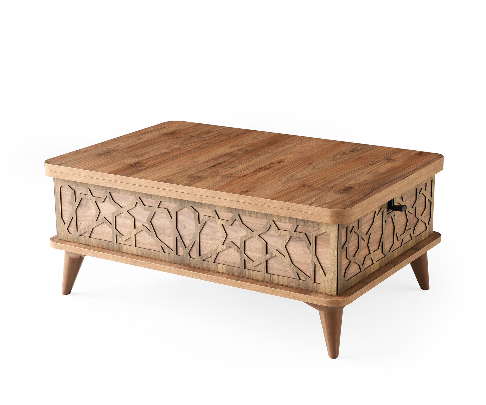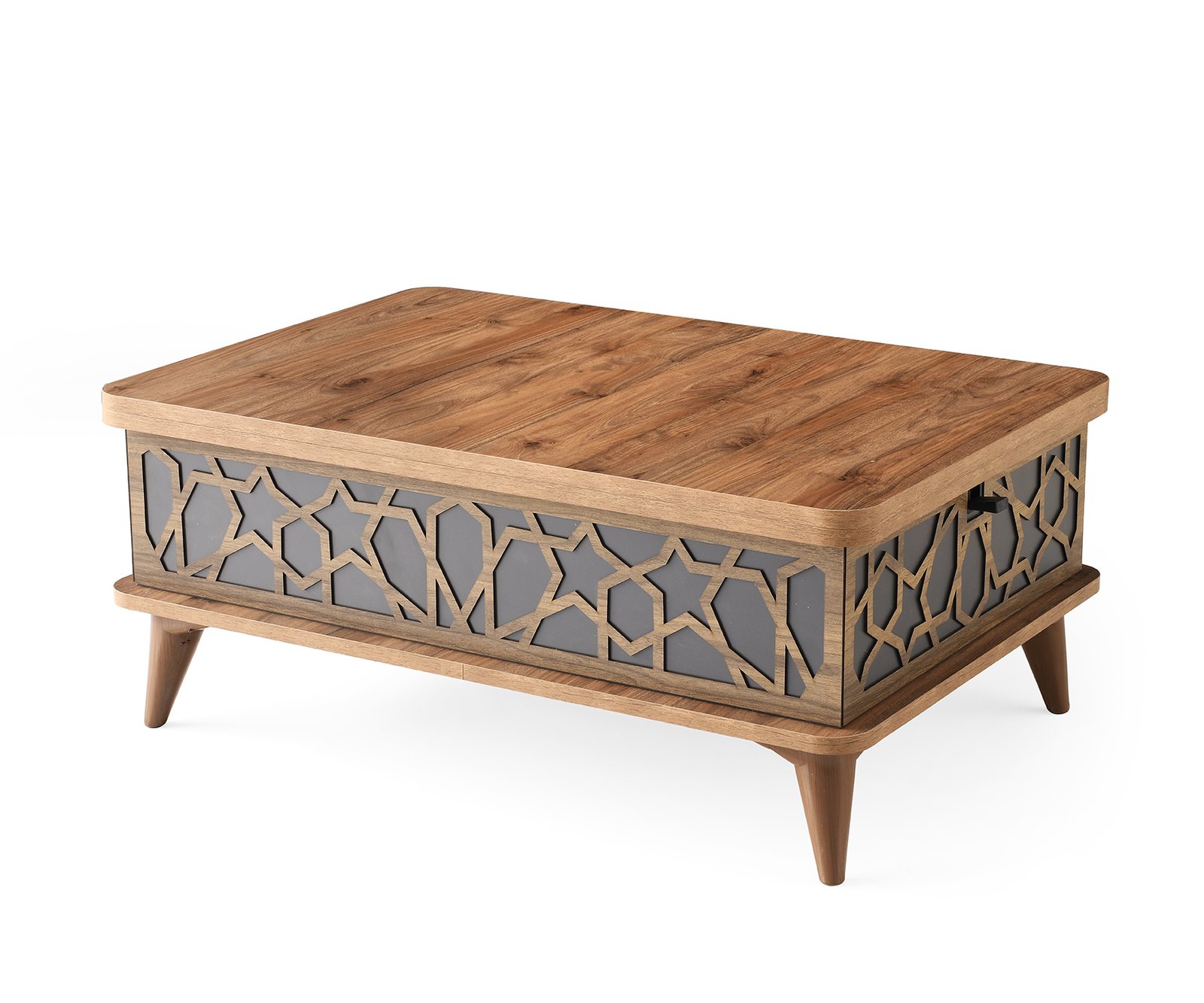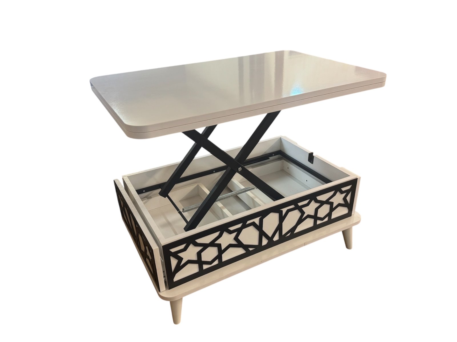 La nevoie, cu ajutorul unui mecanism cu balamale ascunse, masuta se transforma intr-o masa de dining potrivita pentru 4-6 persoane, pentru reuniuni in familie sau intalniri cu prietenii. Nuanta calda de nuc sau ivoire este moderna si se integreaza cu usurinta in orice stil sau decor din locuintă, conferă un aspect elegant si integrează cu succes spatiul din living, fiind solutia ideală atunci cand vrei sa iti valorifici spatiul.