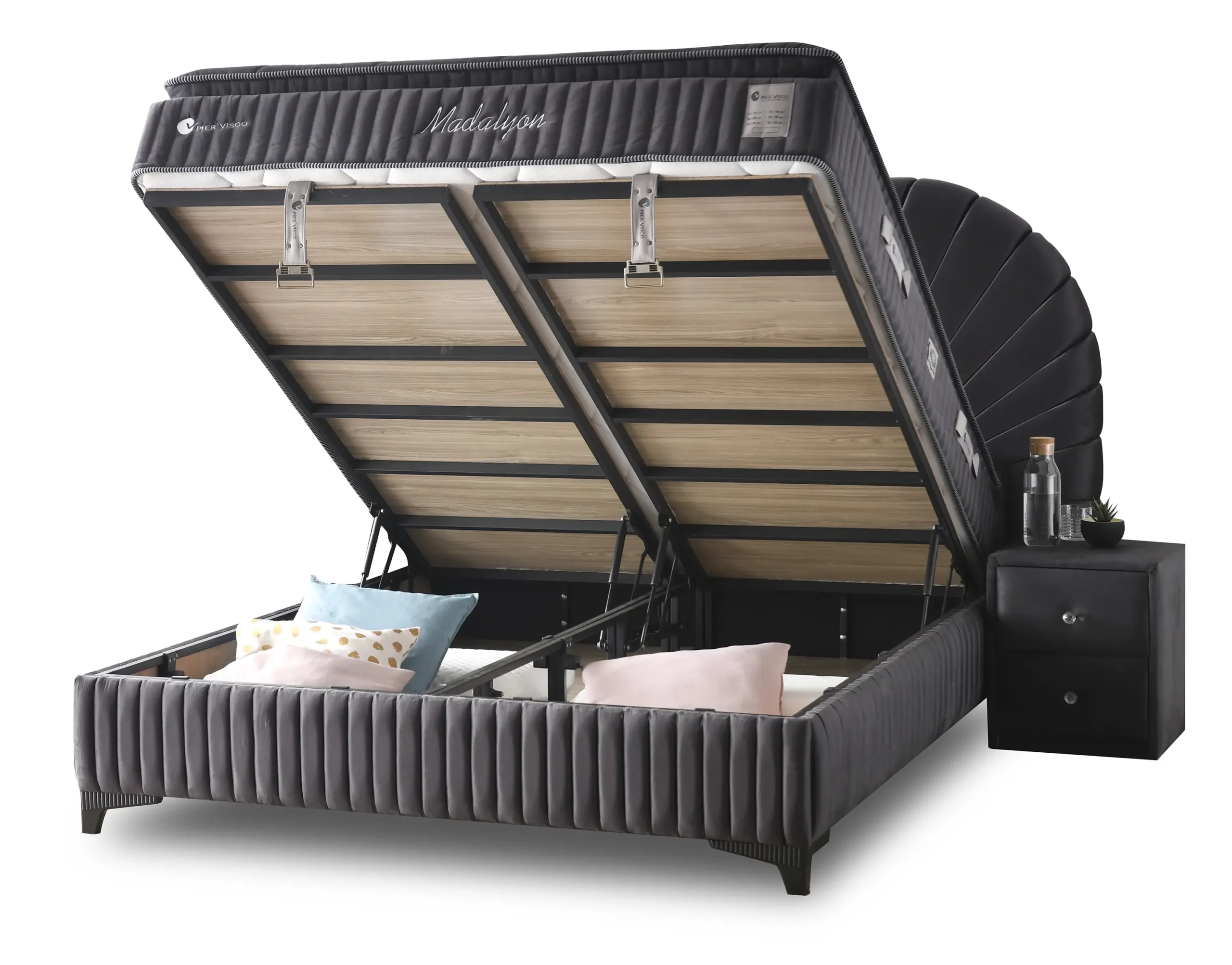 Pat tapițat de lux cu somieră și ladă de depozitare Nirvana – Aerul unui dormitor regal.
