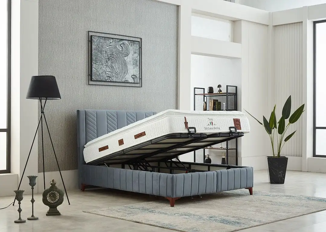 Rabatarea somierilor este asistata de un sistem performant de ridicare prevazut cu pistoane pe gaz, ce poate fi blocat in pozitia ridicata pentru a evita evenimentele neplacute prin coborarea accidentala a ansamblului saltea somiera.