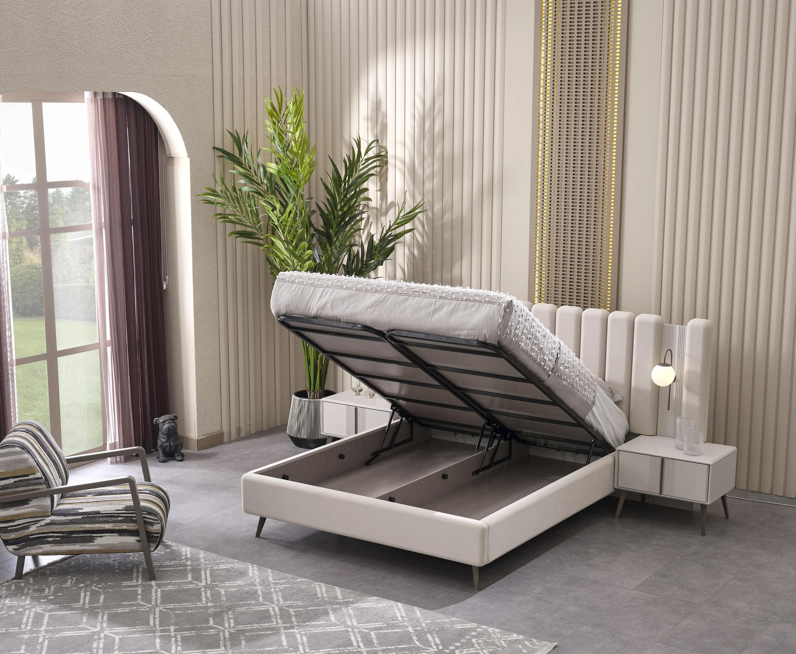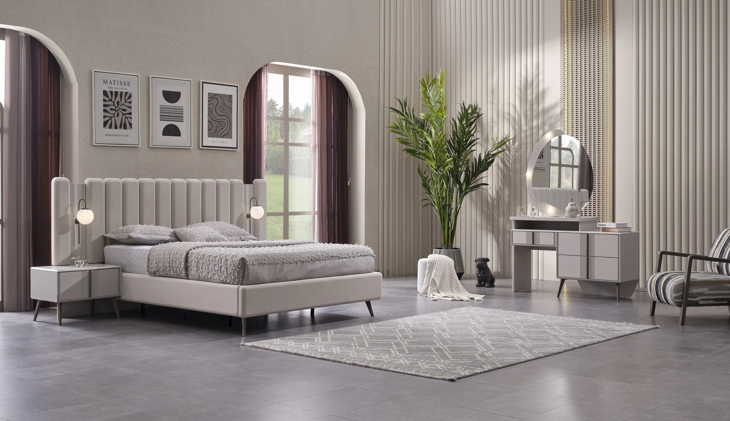Patul este cu siguranta piesa centrala datorita tapiteriei elegante de un crem deschis, imbraca spuma densa de pe spatar sau tablia patului, care sustine pozitia spatelui intr-o pozitie comoda.