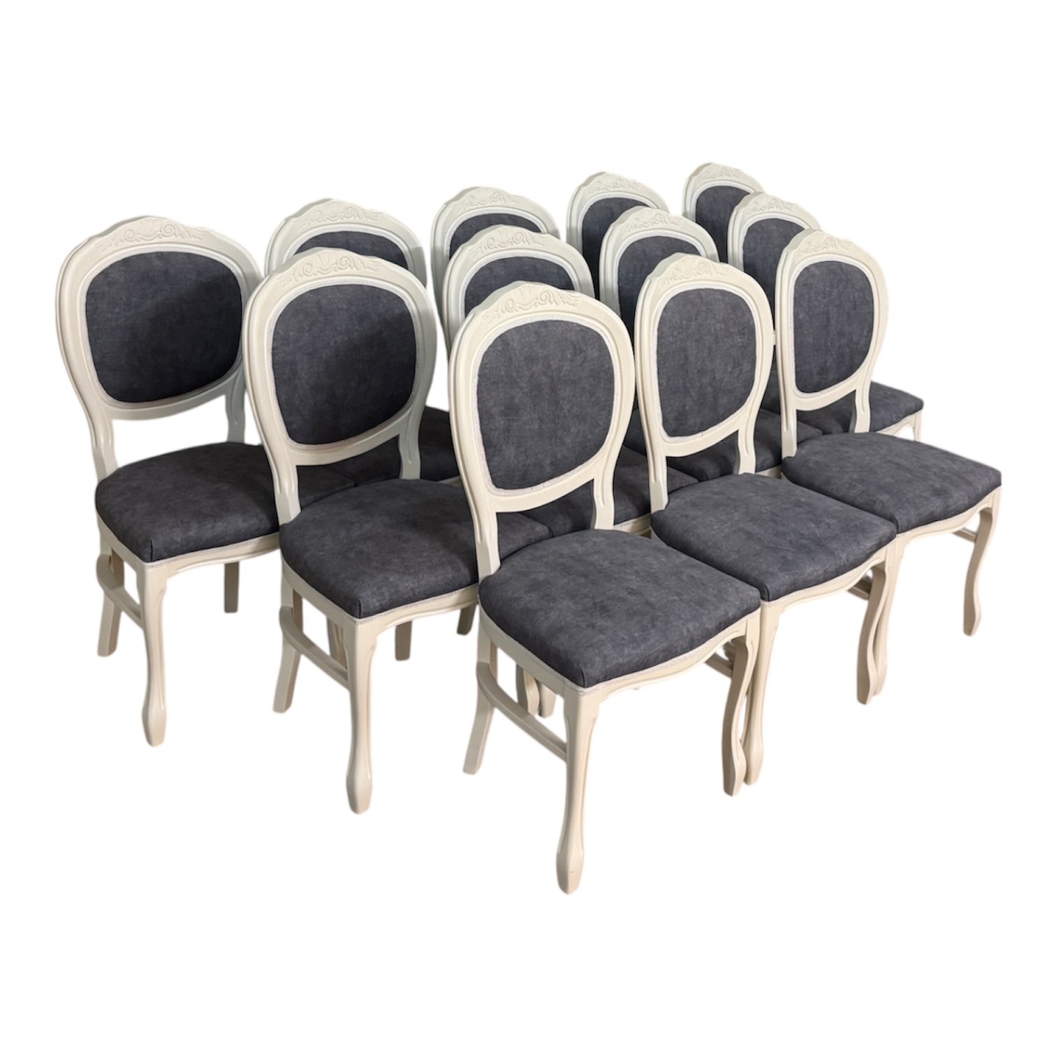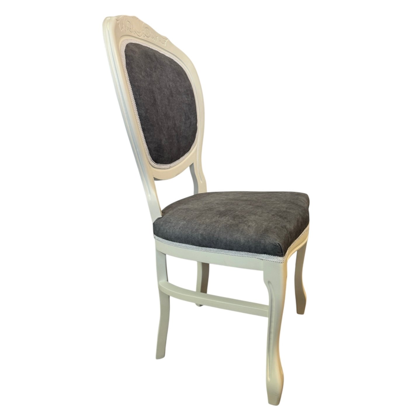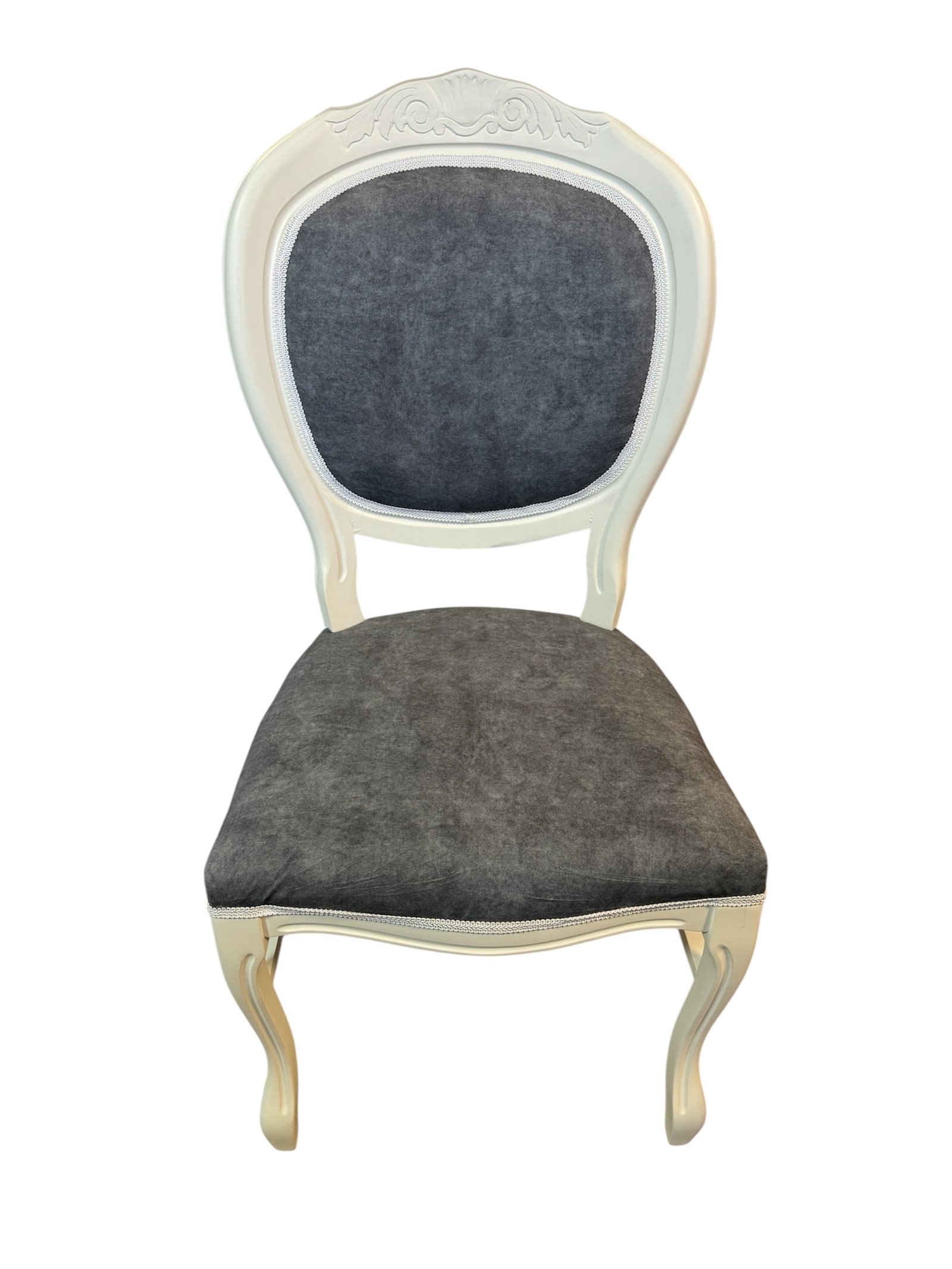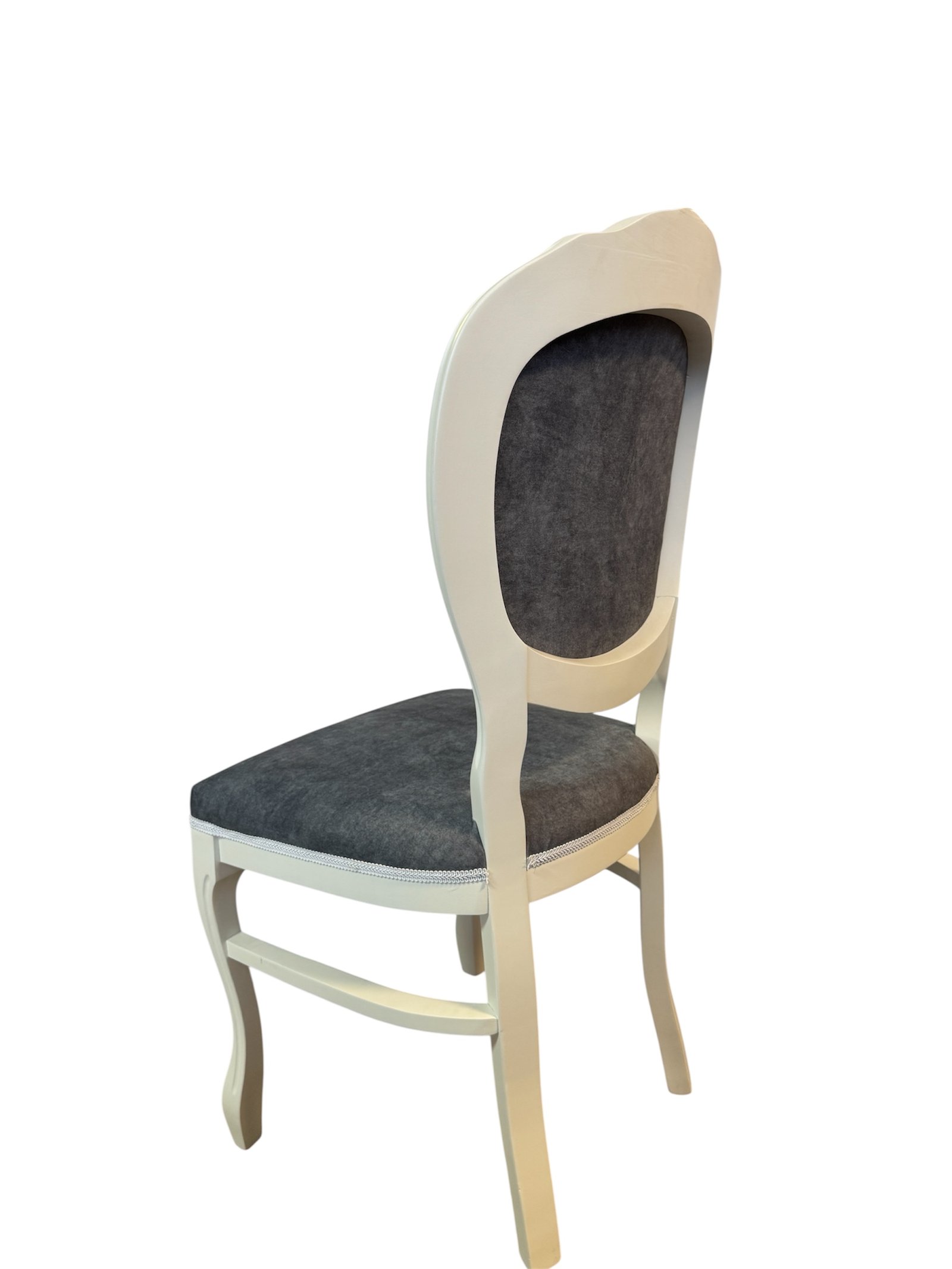 Scaunul Venetiana este o piesă de mobilier rafinată, realizată în stil clasic, ideală pentru dininguri elegante, saloane sau interioare cu accente premium. Cadrul solid din lemn, finisat în nuanță ivoire, este completat de un șezut și spătar tapițate cu material textil gri, oferind un contrast sofisticat și un confort excelent.