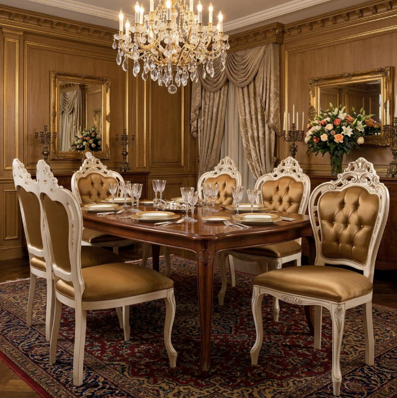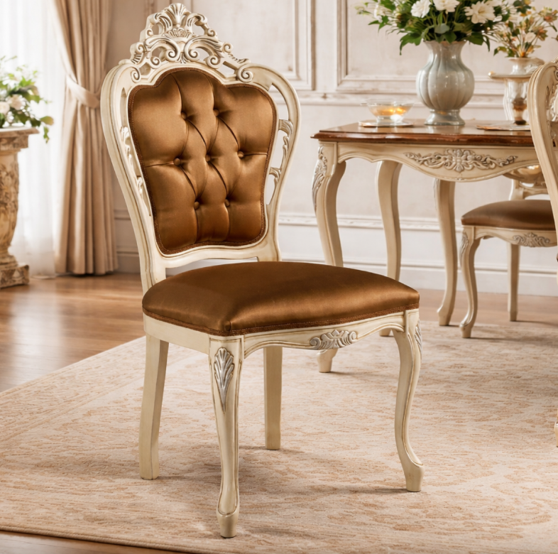 Scaun de dining în stil baroc european, realizat cu structură din lemn și tapițerie satinată, ideal pentru interioare luxoase și rafinate. Designul impresionează prin spătarul înalt cu capitonaj adânc cu nasturi, coroana sculptată decorativ și detaliile ornamentale bogate cu motive florale și frunze de acant. Finisajul ivory cu accente aurii și șezutul satinat în nuanță gold transformă piesa într-un adevărat element statement pentru dining, living sau spații elegante de hotel.