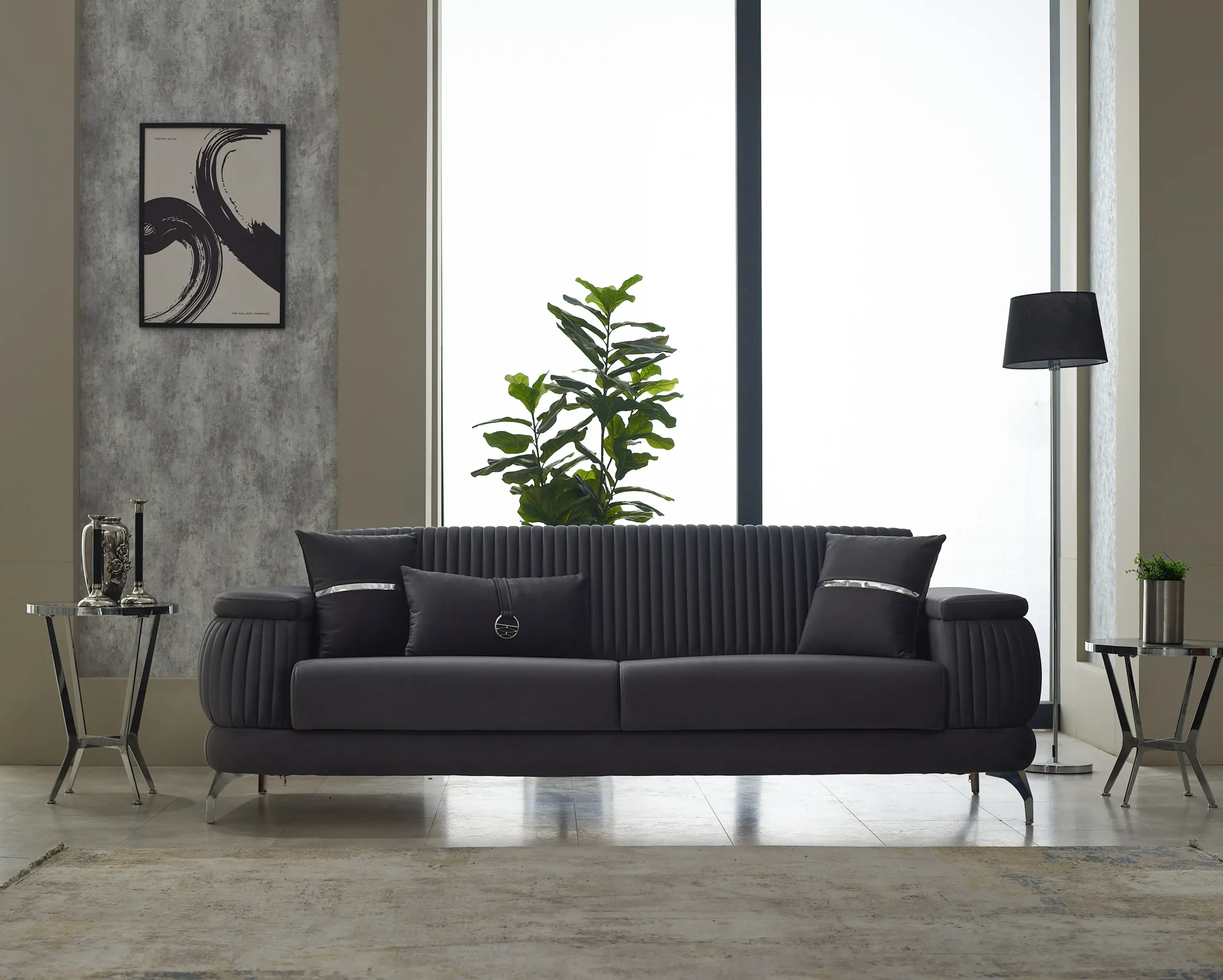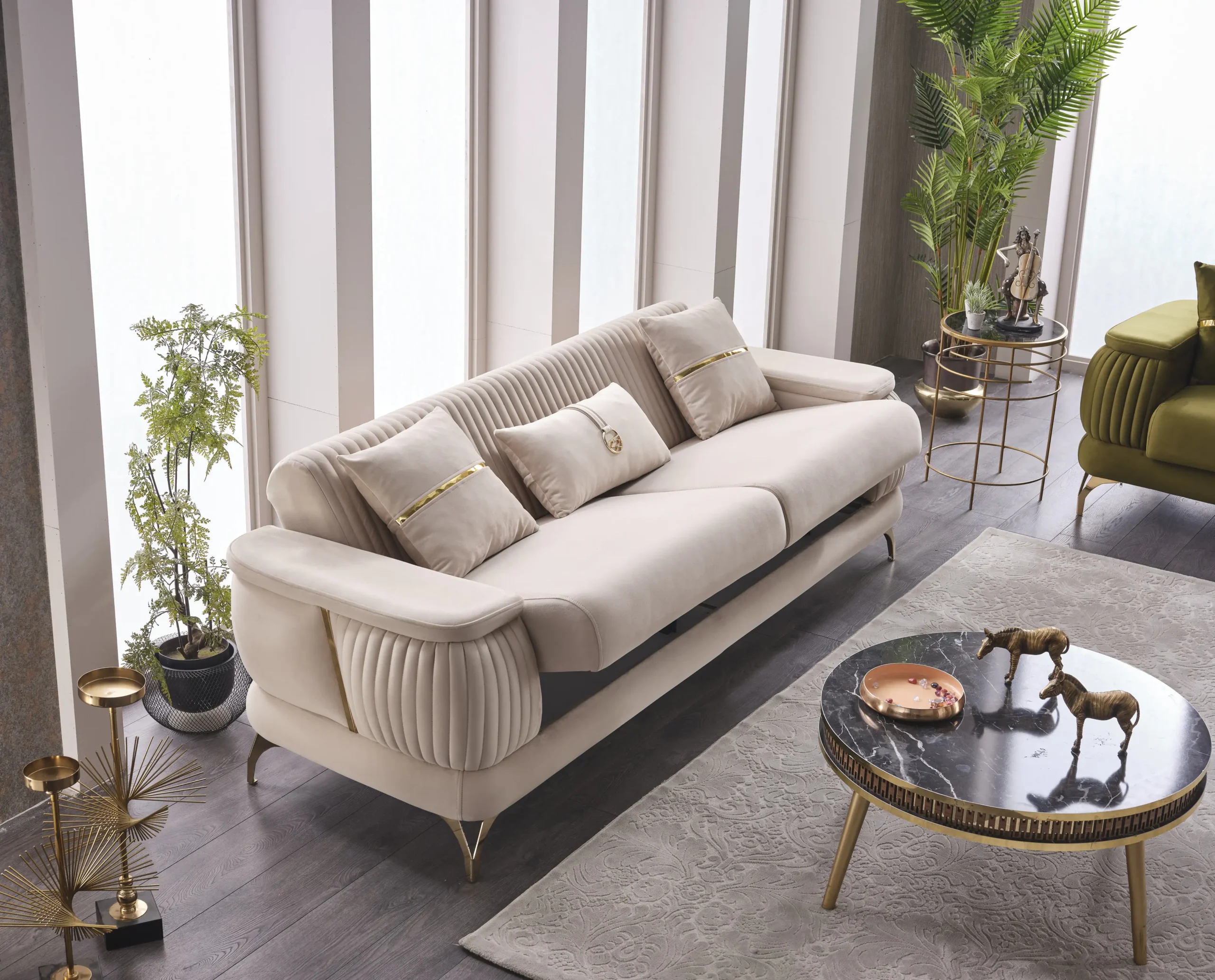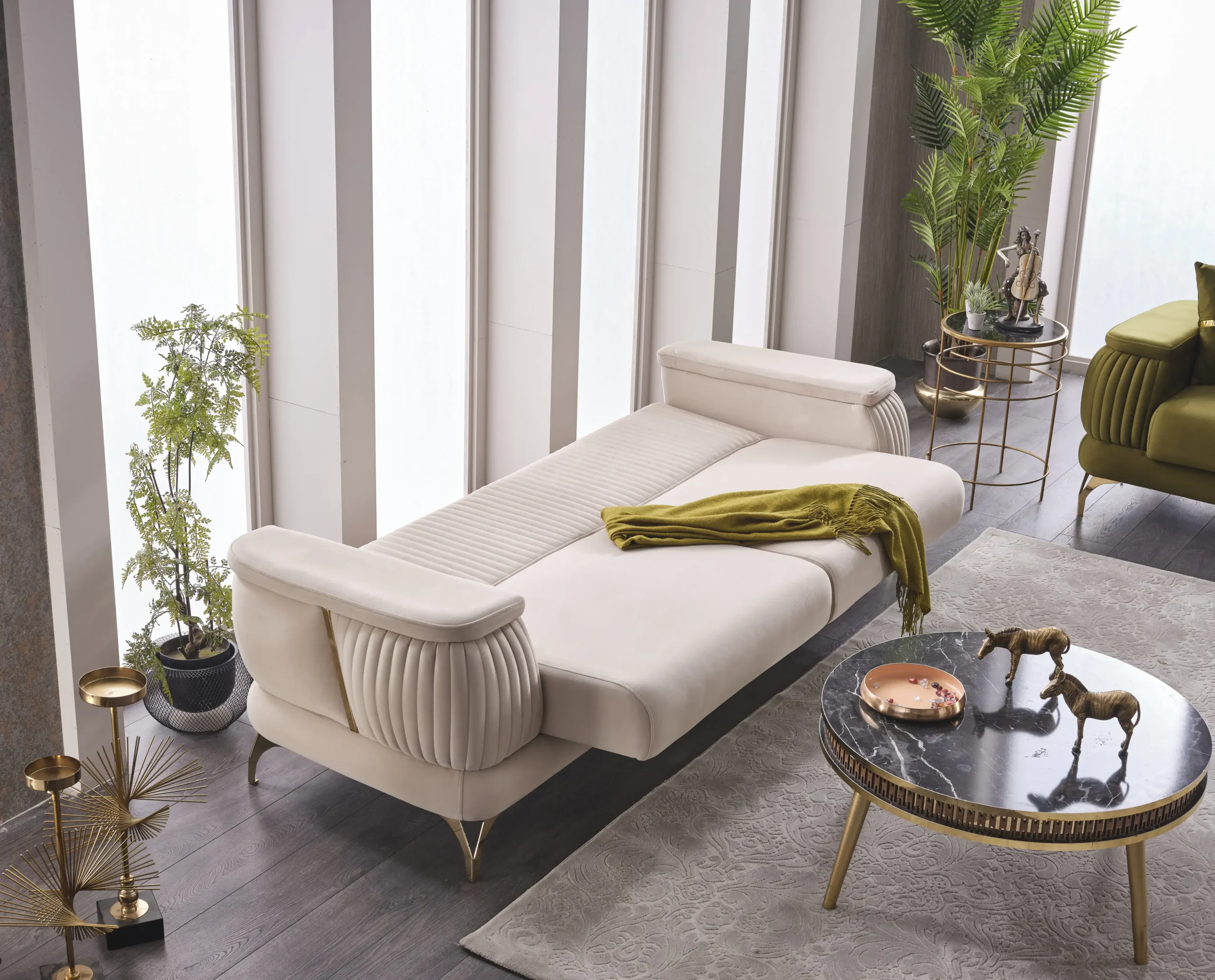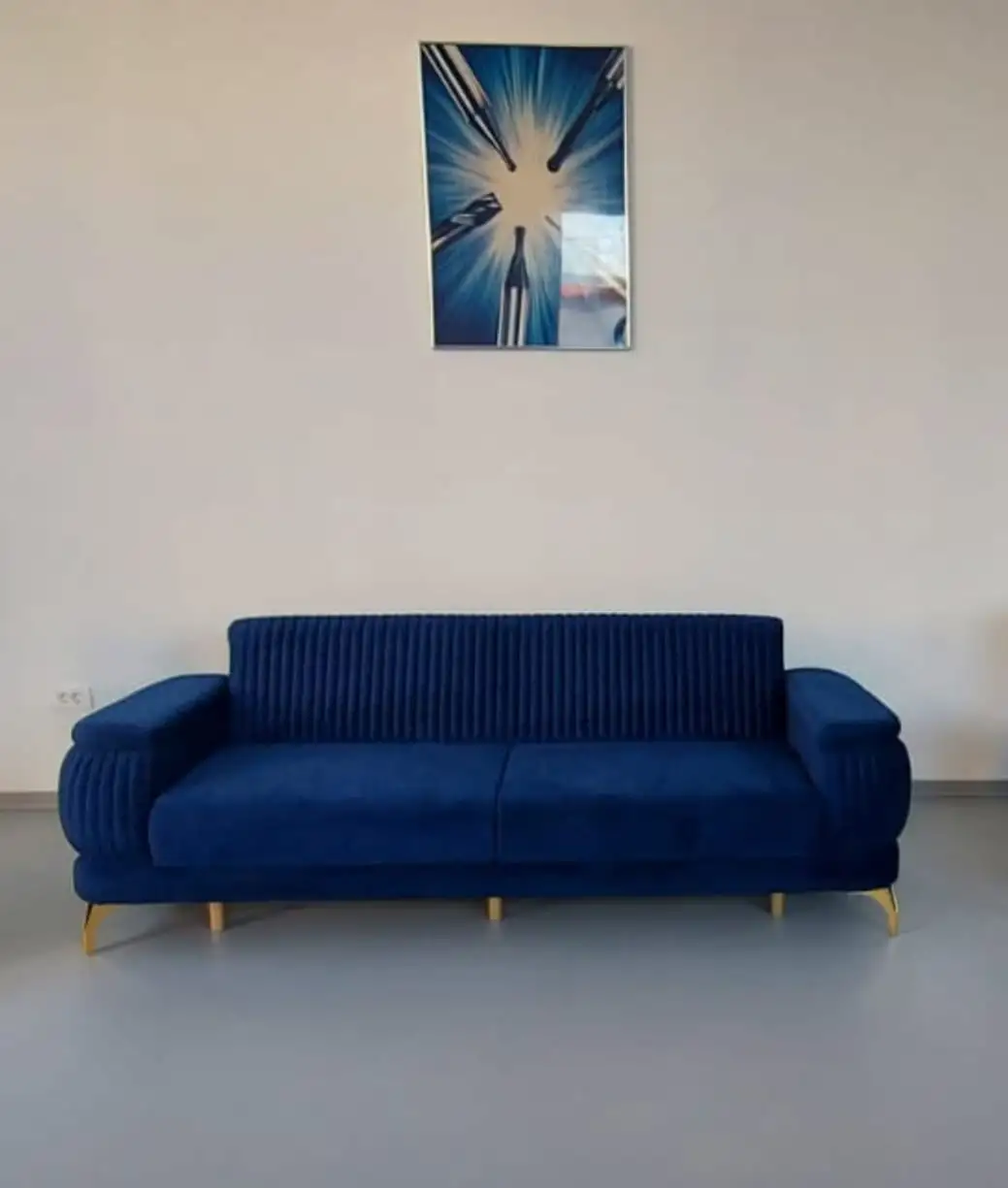 Acest ansamblu rafinat are intrebuintari multiple si se pliaza atat pe apartamentele medii, cat si pe casele ample. Datorita suprafetei generoase a canapelei, poate fi utilizat pe post de canapea fixa sau pe post de pat, cand e extinsa. Aceasta faciliteaza si deplasarea lazii cu mecanisme metalice foarte rezistente in timp si sistem de glisare.