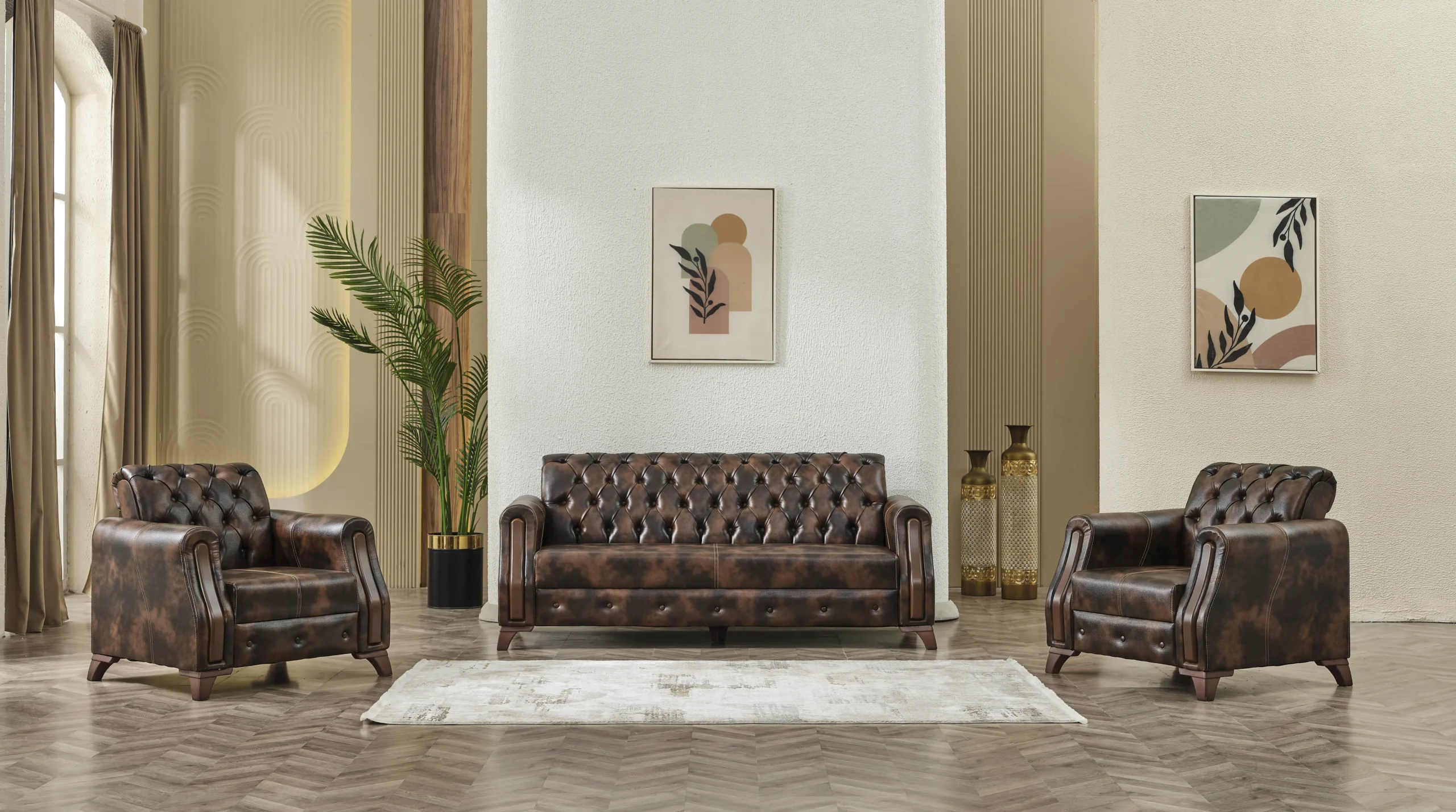 Setul de canapea și fotolii Diplomat Chesterfield face parte din gama noastră de produse de lux, datorită finisajelor perfecte și a materialelor de calitate folosite, reprezentând soluția ideală pentru iubitorii de design clasic, cu aștepări ridicate.