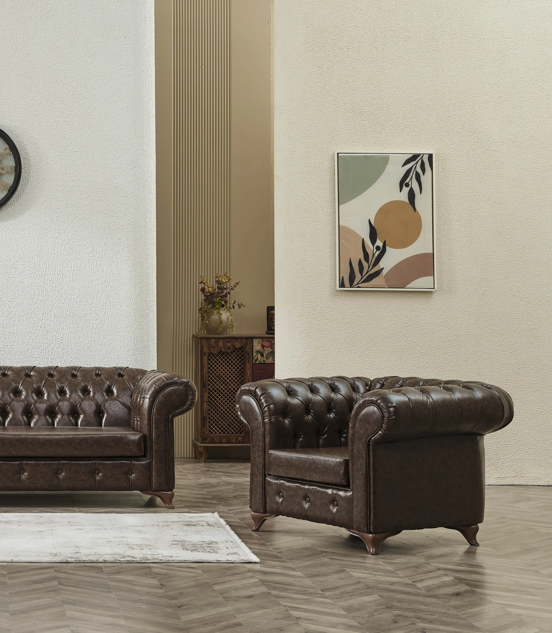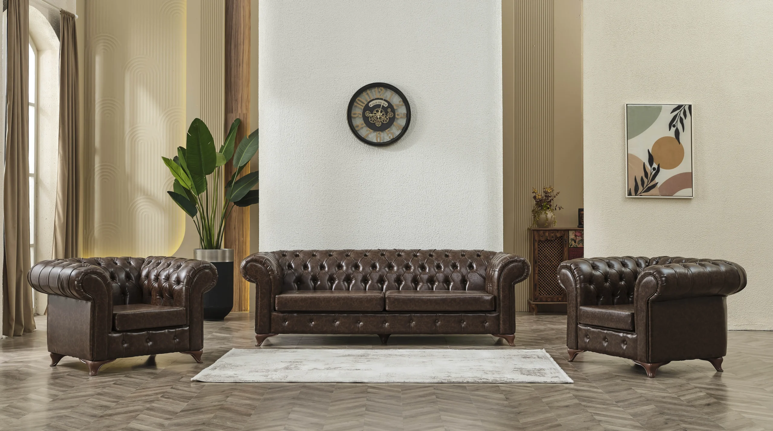 Setul de canapele si fotolii Oxford Chesterfield face parte din gama noastră de produse de lux, datorită finisajelor perfecte și materialelor de inalta calitate folosite, reprezentand soluția ideală pentru iubitorii de design clasic, cu aștepări ridicate.