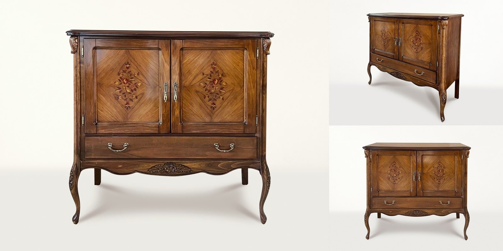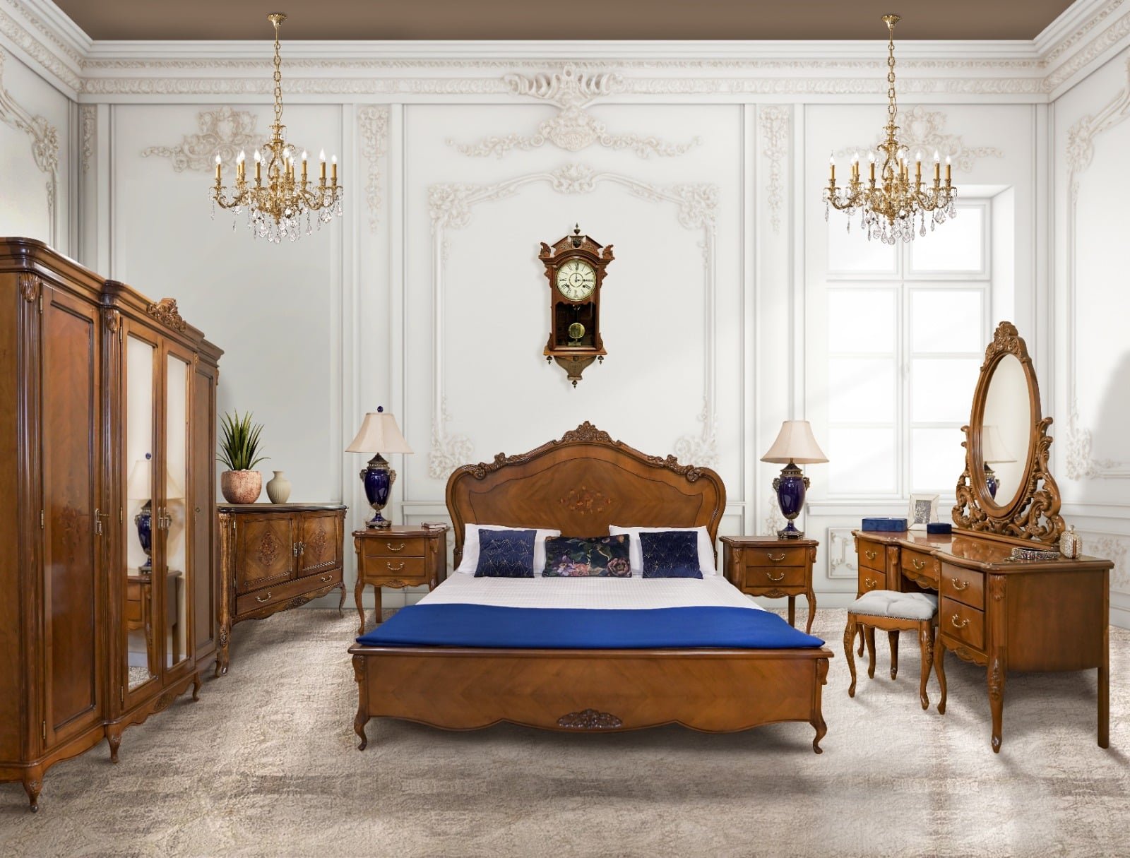 Setul de dormitor „Anabella” este o oază de eleganță și stil, proiectată pentru a oferi un sanctuar personal de răsfăț. Dominată de un pat cu dimensiuni generoase, acesta este încadrat de o capătâie înaltă, căptușită în nuanțe de gri, detaliată cu butoni decorativi care crează un efect tufted de lux. Lemnul masiv ce formează baza și picioarele patului este finisat cu atenție, fiecare curbă și colț sculptate manual pentru a scoate în evidență frumusețea naturală a lemnului. Noptierele și comoda își etalează suplețea prin liniile curate, ornamentate cu mânere elegante în stil baroc, finisate în aur, care reflectă opulența și atenția la detaliu.