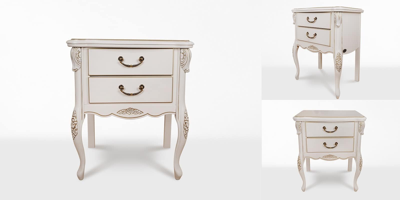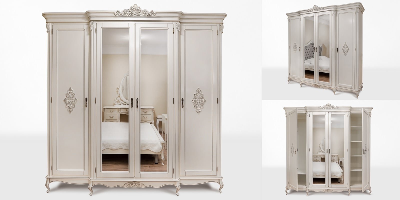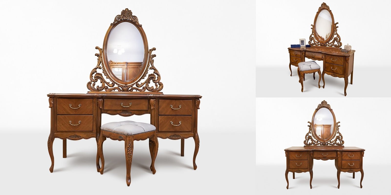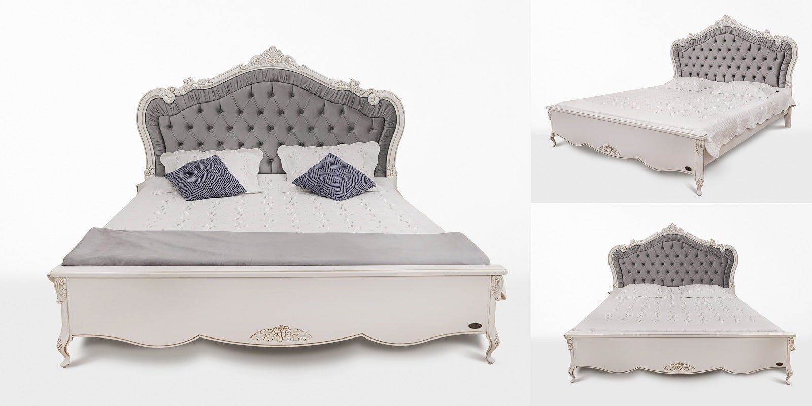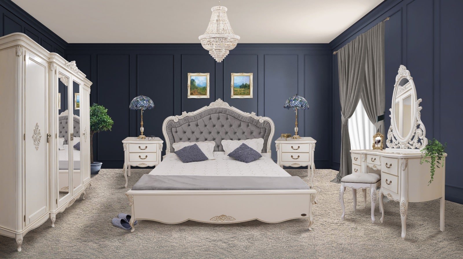 Dulapul de haine, un element central al camerei, este echipat cu oglinzi ample, rame elaborate și sculpturi manuale, oferind nu numai funcționalitate, dar și un punct de atracție vizual. Masa de toaletă cu oglindă este desăvârșită, mărginită de finisaje albe și aurii, în timp ce oglinda detaliată completează ansamblul cu un aer de noblețe și distincție. Fiecare piesă a setului „Isabella” a fost concepută cu o atenție deosebită pentru detalii, rezultând un dormitor care este nu numai un loc de odihnă, ci și un spațiu de expresie personală și estetică desăvârșită.