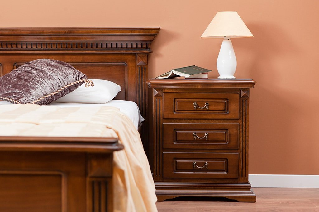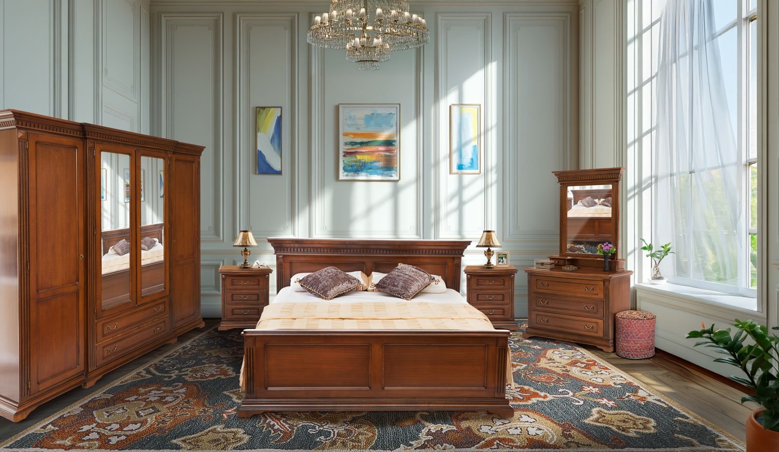 Setul de dormitor „Filip” este o celebrare a stilului clasic, reinterpretat pentru a se potrivi confortului contemporan. Lucrat meticulos din lemn masiv de fag și tei, acest set evocă o senzație de permanență și stabilitate. Panourile din PAL și MDF, îmbogățite cu finisaje de furnir de nuc, conferă un echilibru vizual și o adâncime călduroasă care completează nuanțele de maro ale lemnului. Ornamentele sculptate manual sunt dovada unui artizanat desăvârșit, fiecare detalii fiind atent modelată pentru a aduce un plus de eleganță și caracter întregului ansamblu. Designul robust al patului este compensat de liniile fluide ale noptierelor și comodei, creând o armonie care invită la relaxare și liniște.