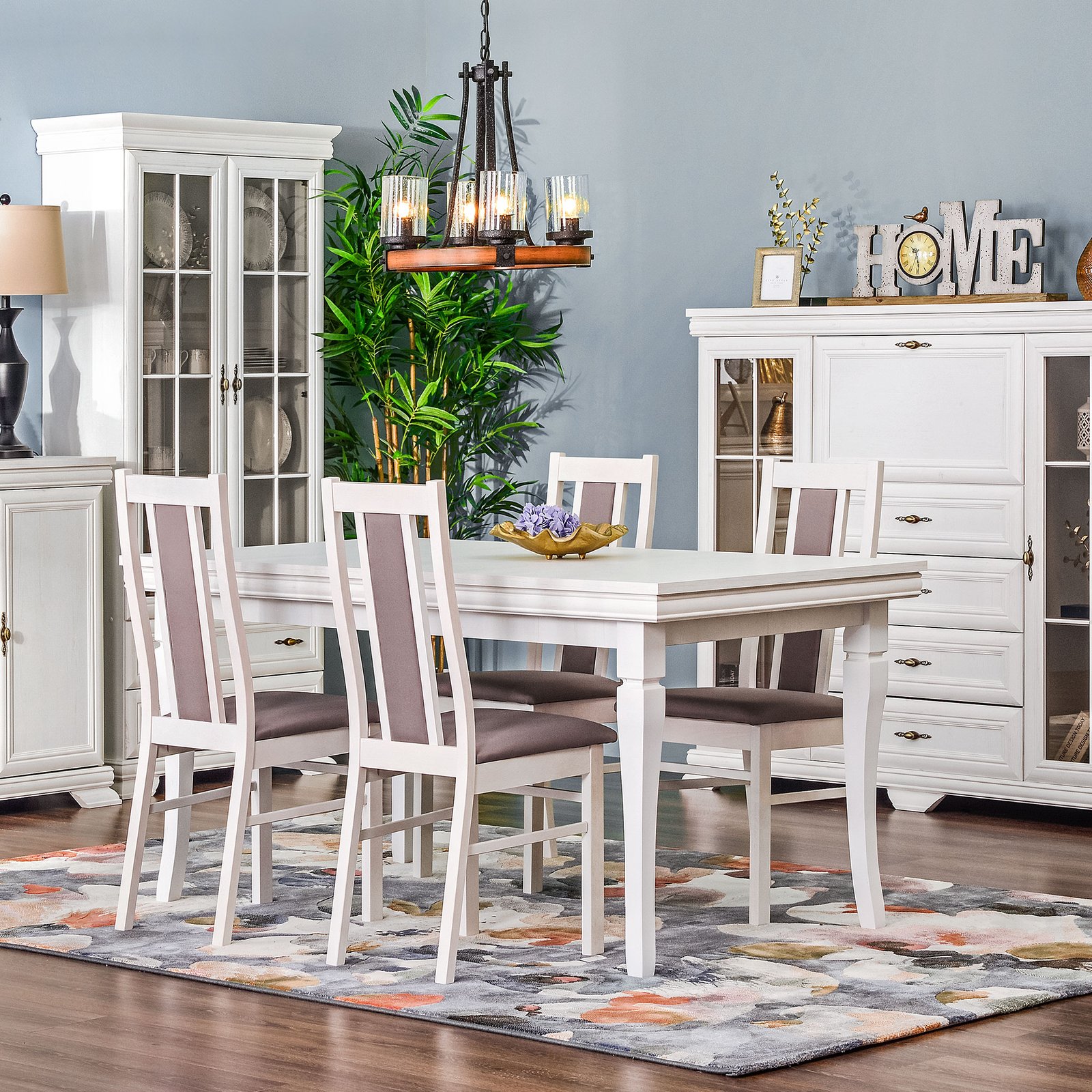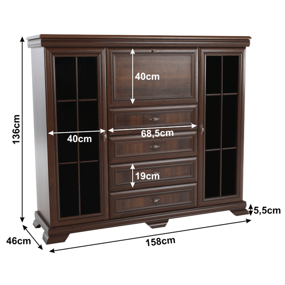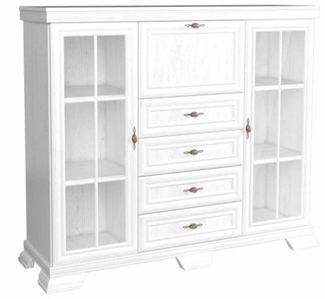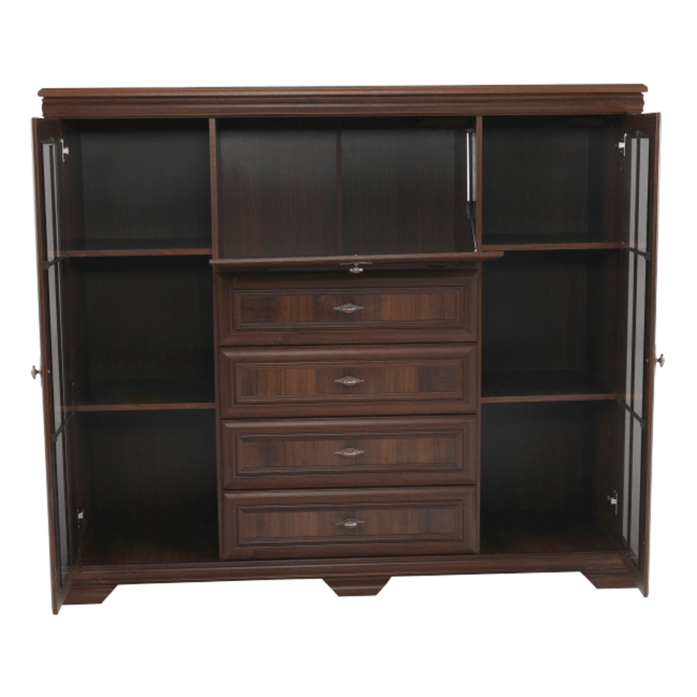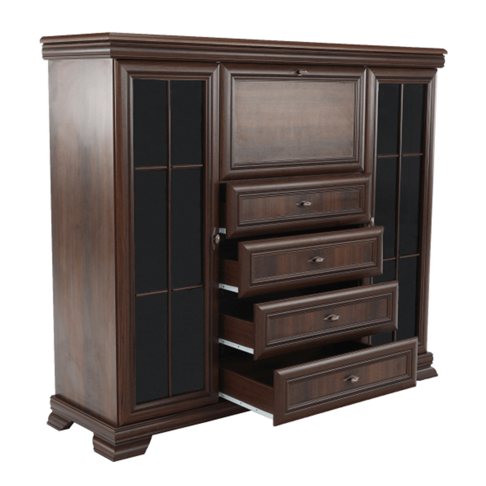 Comoda AROCA este combinată cu dulap de bar. Spaţiul de depozitare este oferit de două dulapuri tip vitrină şi patru sertare la fel de adânci. Dulapurile sunt cu două rafturi împărţite în trei zone de depozitare. Uşile vitrinelor sunt cu sticlă.